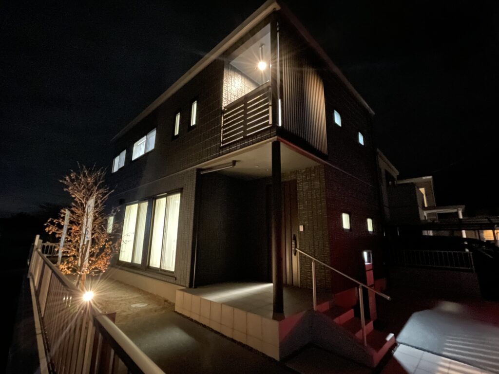 夕暮れ時にライトアップされた2階建て住宅の外観写真