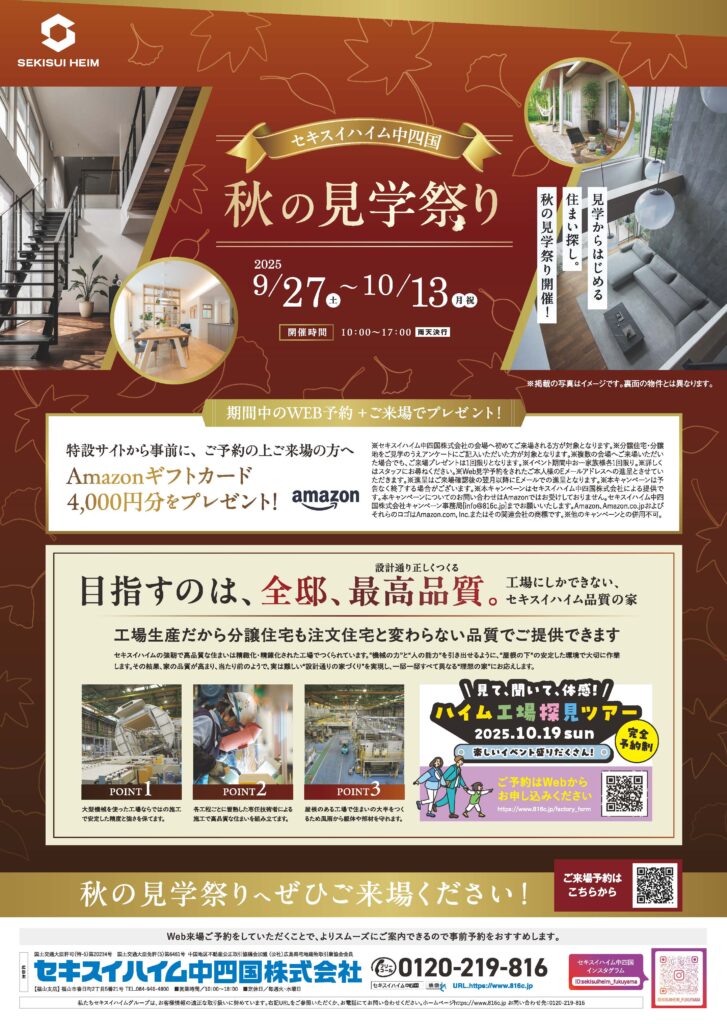 ※ご来場特典は、セキスイハイム中四国株式会社の会場へ初めてご来場される方が対象となります。※分譲住宅・分譲地をご見学の上、アンケートにご記入いただいた方が対象になります。※複数の会場へご来場いただいた場合でも、ご来場プレゼントは1回限りとなります。※イベント期間中お一家族様各1回限り。※詳しくはスタッフにお尋ねください。※Web見学予約されたご本人様のEメールアドレスへの進呈とさせていただきます。進呈はご来場確認後の翌月以降にEメールへ進呈となります。※本キャンペーンは予告なく終了する場合がございます。※本キャンペーンはセキスイハイム中四国株式会社による提供です。※本キャンペーンについてのお問い合わせはAmazonではお受けしておりません。セキスイハイム中四国株式会社キャンペーン事務局(info@816c.jp)までお願いします。Amazon、Amazon.co.jpおよびそれらのロゴはAmazon.com,Inc.またはその関連会社の商標です。※他のキャンペーンとの併用は不可です。