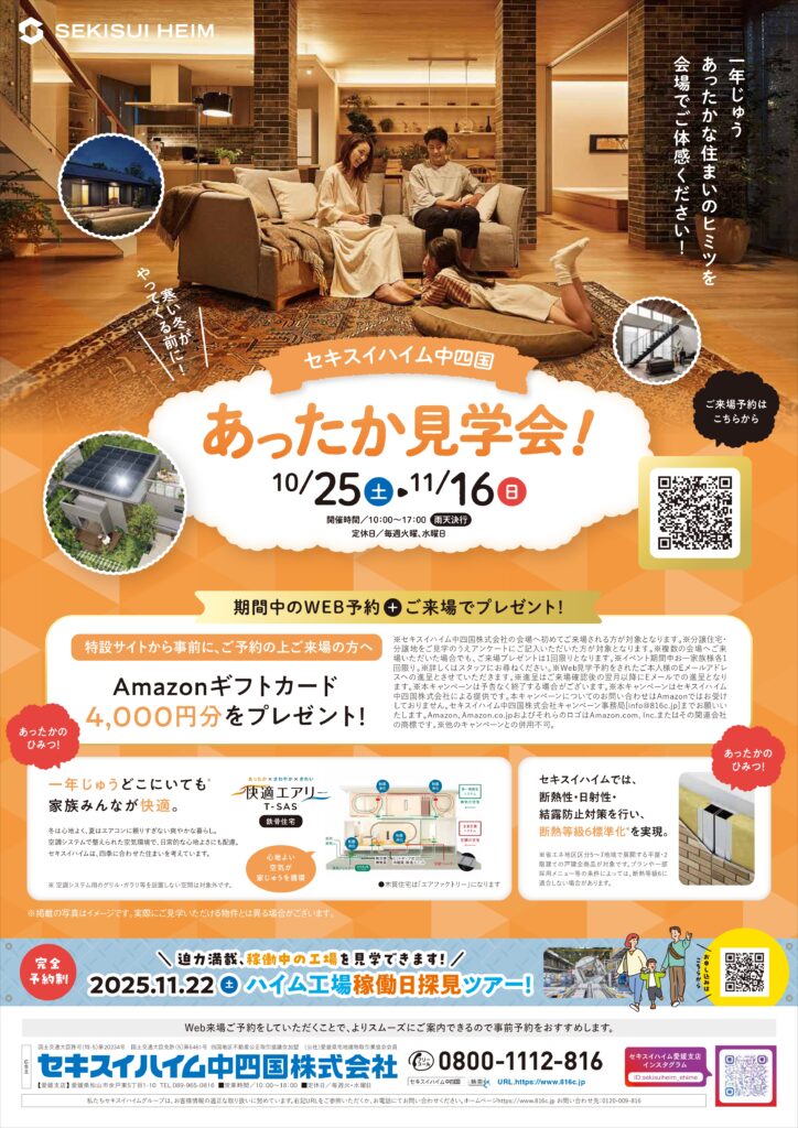 - 特設サイトから事前にご予約の上ご来場の方へAmazonギフトカード4000円分をプレゼント※セキスイハイム中四国(株)初めてご来場される方が対象となります。分譲住宅をご見学の上アンケートにご記入いただいた方が対象となります。複数の会場へご来場いただいた場合もご来場プレゼントは1回限りとなります。