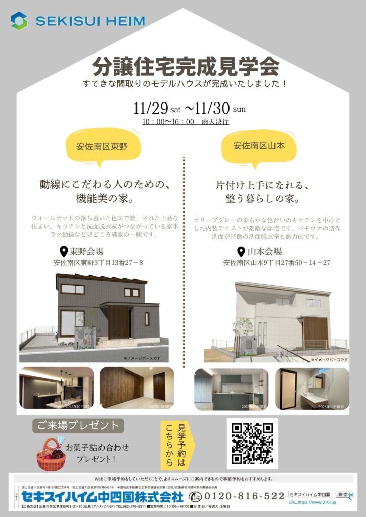 🎉🏡 完成見学会のお知らせ 🏡🎉 すてきな間取りのモデルハウスがついに完成しました! 2日間限定の特別公開です✨ 📅 11/29(土)~ 11/30(日) ⏰ 10:00~16:00(雨天決行) ⸻ 📍 安佐南区 東野モデルハウス 🚶♂️「動線にこだわる人」のための 機能美の家 ✨ ウォールナットの落ち着いた色味で統一した上品な住まい🏠 キッチンと洗面脱衣室がつながる家事ラク動線が魅力です👏 住所:安佐南区東野3丁目13番27-8 ⸻ 📍 安佐南区 山本モデルハウス 🧺「片付け上手になれる」 整う暮らしの家 ✨ オリーブグレーの柔らかな色合いのキッチンを中心に、 内装デザインが落ち着いた雰囲気に仕上がっています🌿 造作洗面や、家事動線を考えた配置もポイント◎ 住所:安佐南区山本9丁目27番50-14-27 ⸻ 🎁 ご来場プレゼント お子さまも喜ぶ♪ 🍭 お菓子詰め合わせプレゼント! 🍬 ⸻ 📱 ご予約はこちらから QRコードより簡単予約👍 当日スムーズにご案内できます✨ 皆さまのご来場を心よりお待ちしております