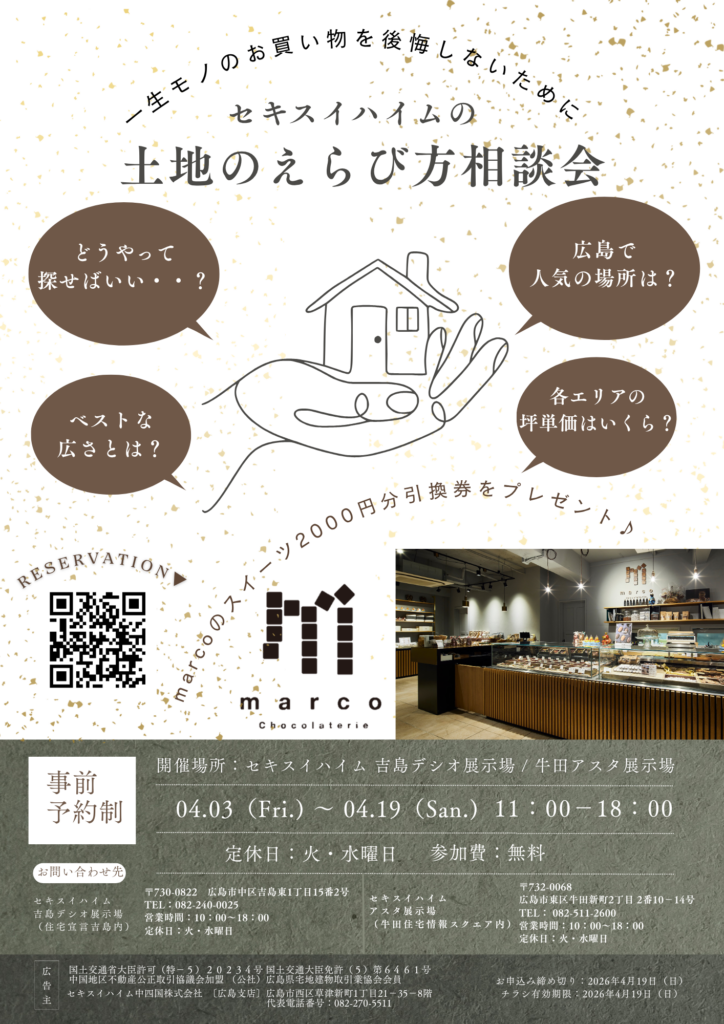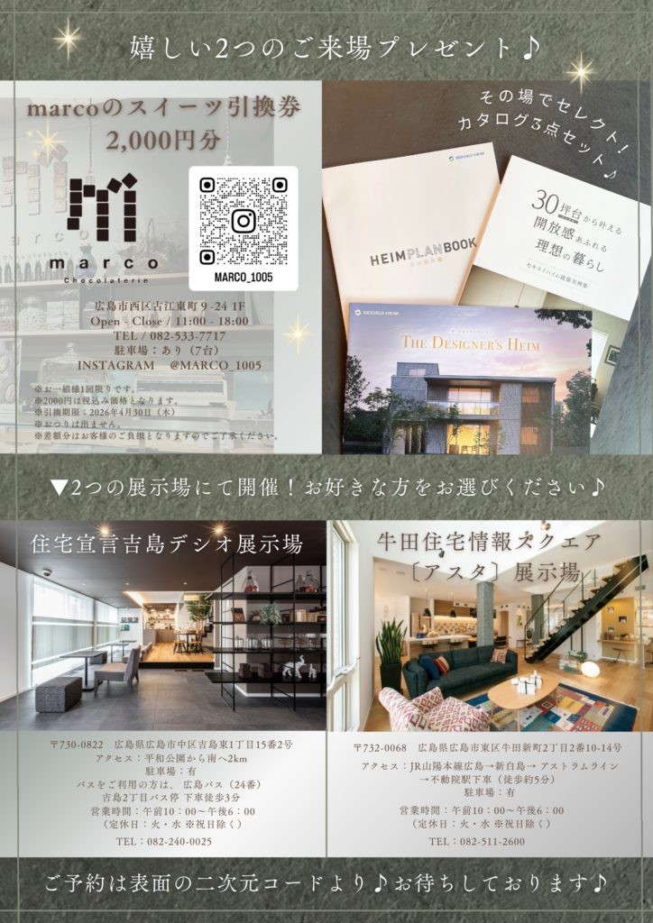 - 住宅宣言吉島デシオ展示場:082-240-0025 牛田住宅情報スクエア〔アスタ〕展示場:082-511-2600