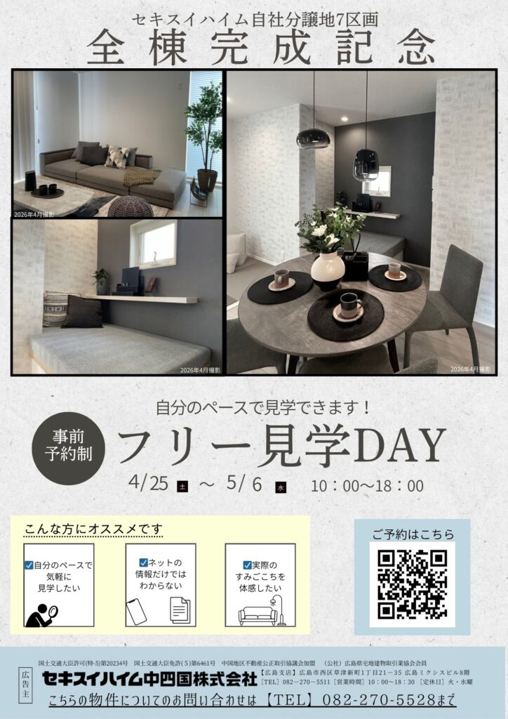 🎉全棟完成記念! 廿日市市大野エリアにて、 分譲住宅 フリー見学DAYを開催いたします。 ⏰自分のペースで気軽に住まい見学 本イベントは事前予約制のフリー見学会です✨