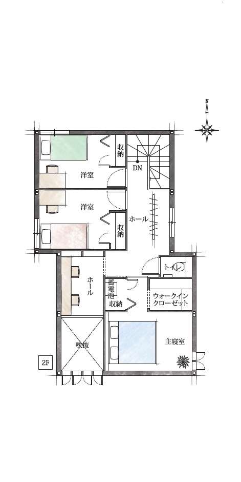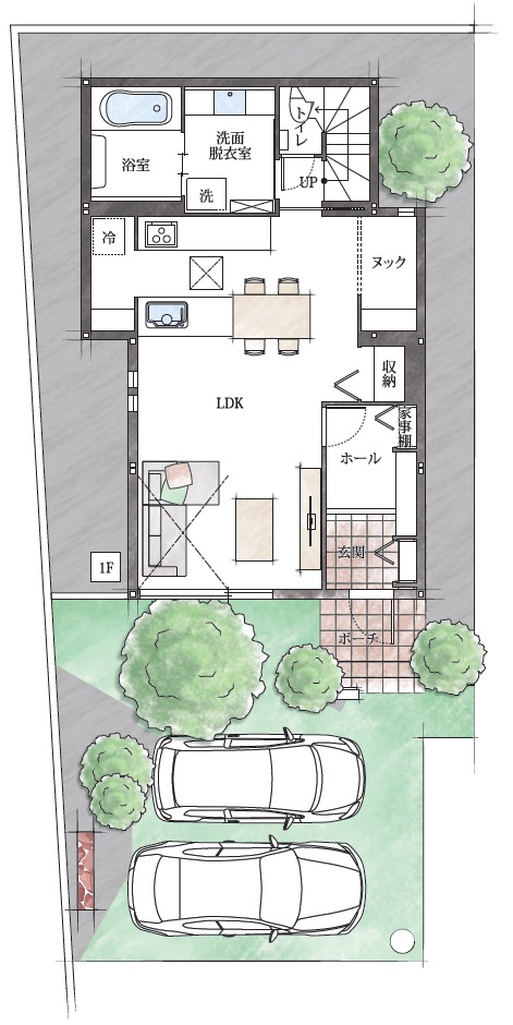 - 延床:105.66㎡(31.96坪) 、1F:56.07㎡(16.96坪) 、2F:49.59㎡(15.00坪)