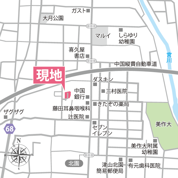 - JR津山線・JR姫新線「津山」駅 2,700~2,780m(徒歩34〜35分)