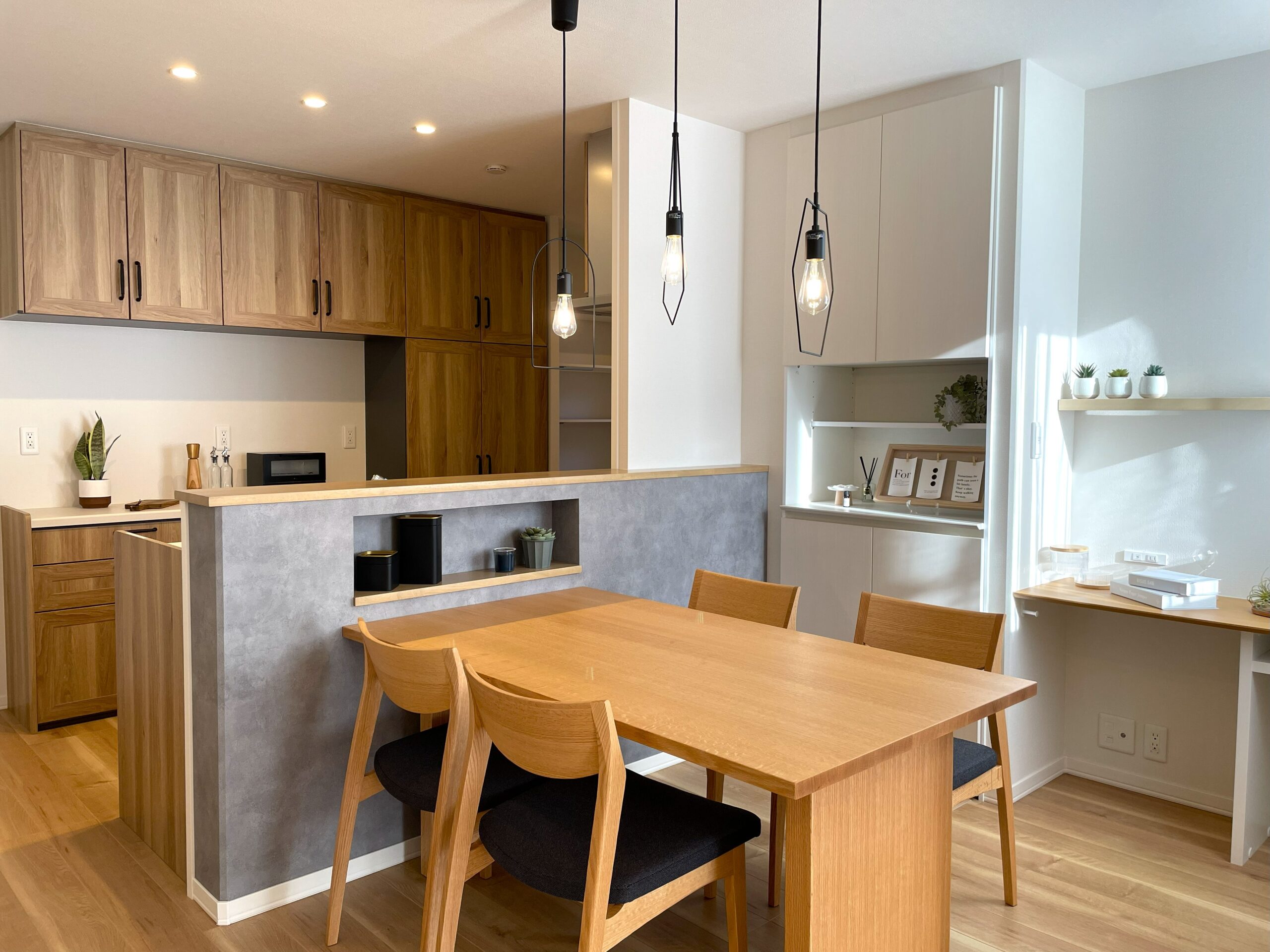 リビング全体が見渡せるオープンタイプの対面キッチンを採用。