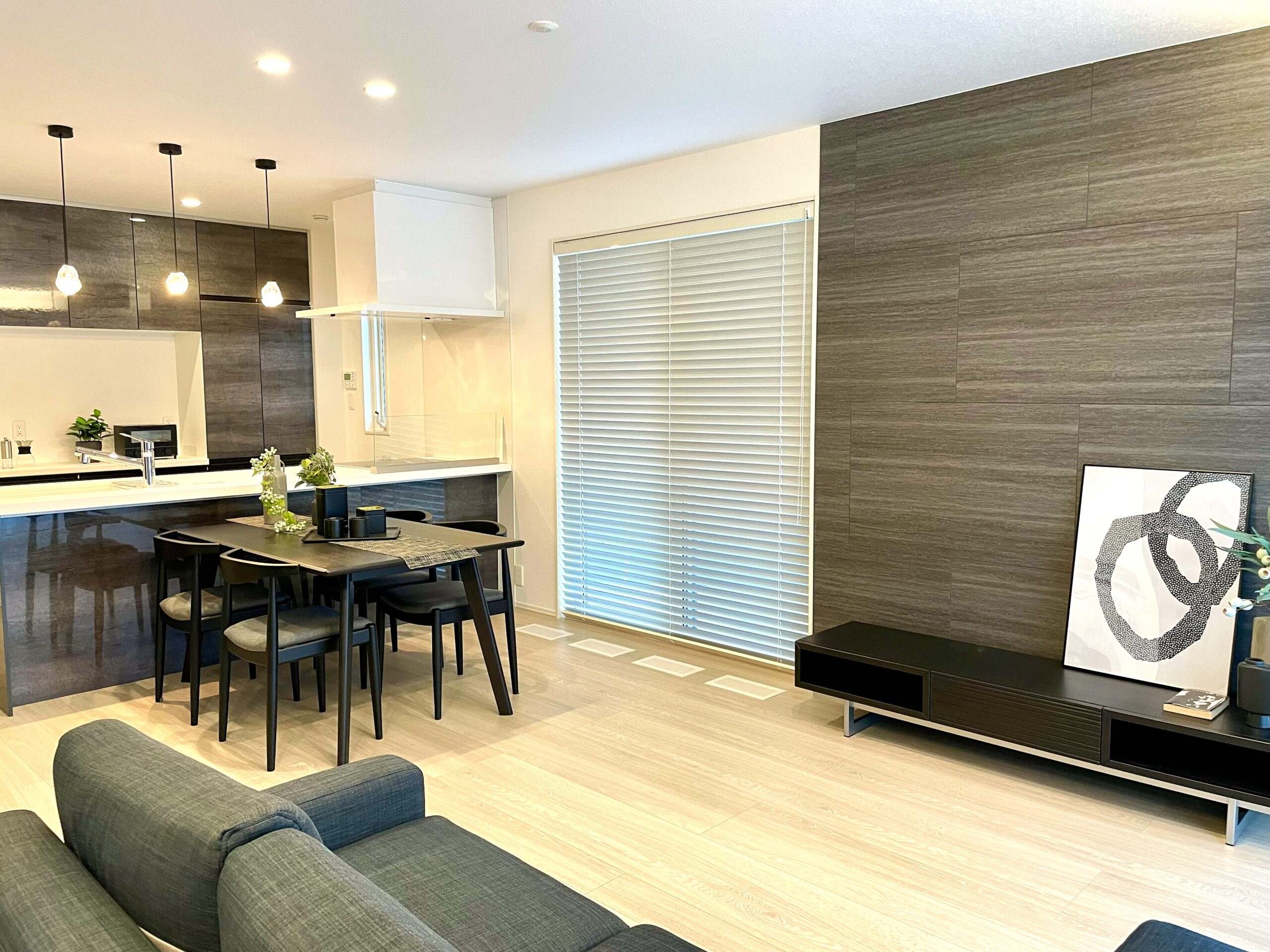 ダークトーンの家具と間接照明で個性的なLDK。