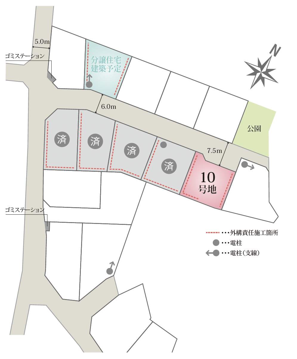 - 北側6.0m 分譲地内6.0~7.5m(開発道路)