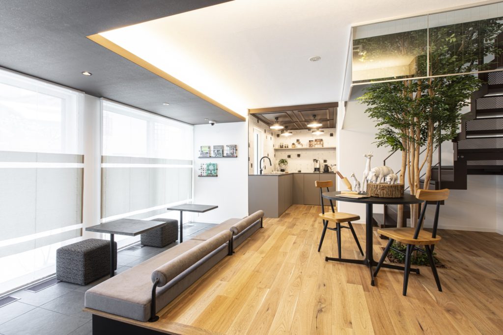 - 当展示場は、店舗併用住宅をコンセプトにした3階建て住宅です。1階はカフェを併設したチョコレートのアンテナショップをイメージした間取りになっています。