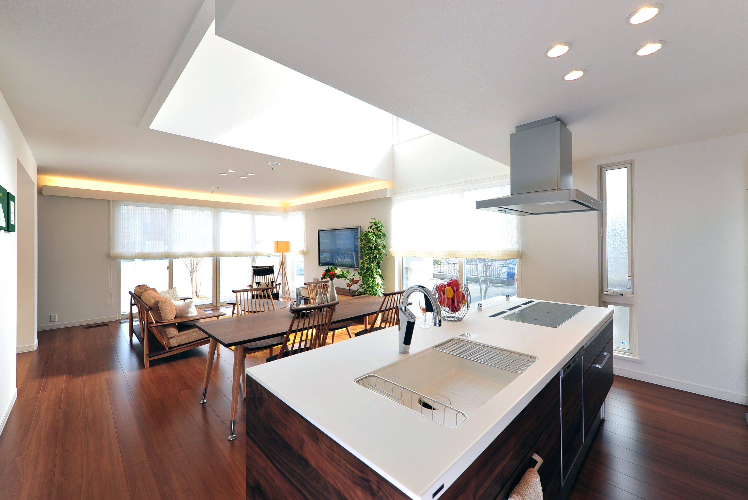 吹き抜けのある明るく開放的なダイニング&キッチン。清潔感あるアイランドキッチンは、忙しい奥様に嬉しい、使い勝手の良い先進の設備です。アイランドだからごはんの仕度をしながらも家族とのコミュニケーションがとれるのもうれしい。
