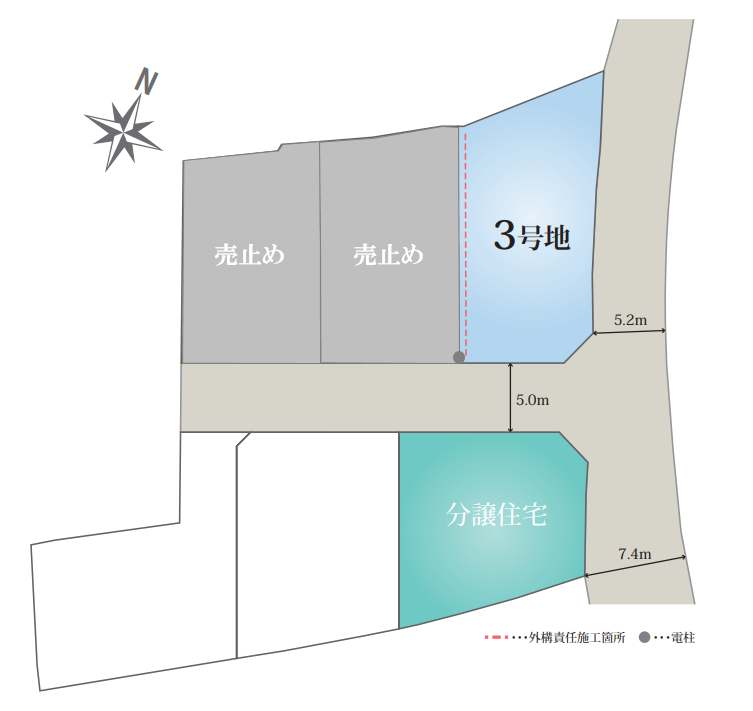 - 2、3号地の境界工事は原則、西側敷地内に施行。(仕様指定なし) 6号地の西側隣地は他社区画と相談。 図面と現況が相違する場合は現況優先とさせていただきます。