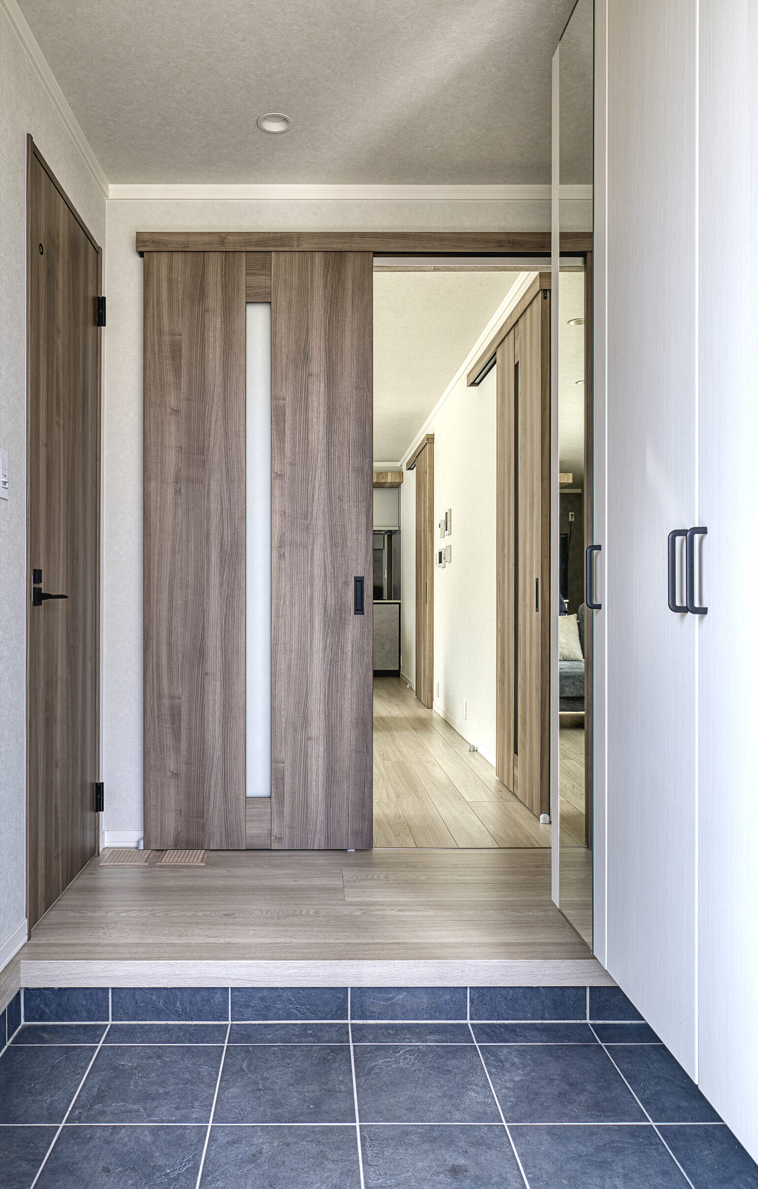 収納をまとめ、出入りの動作がスムーズに流れる玄関動線を確保。壁や床、照明など同色系で揃え、一歩入ると落ち着きのあるトーンの仕上がりに。