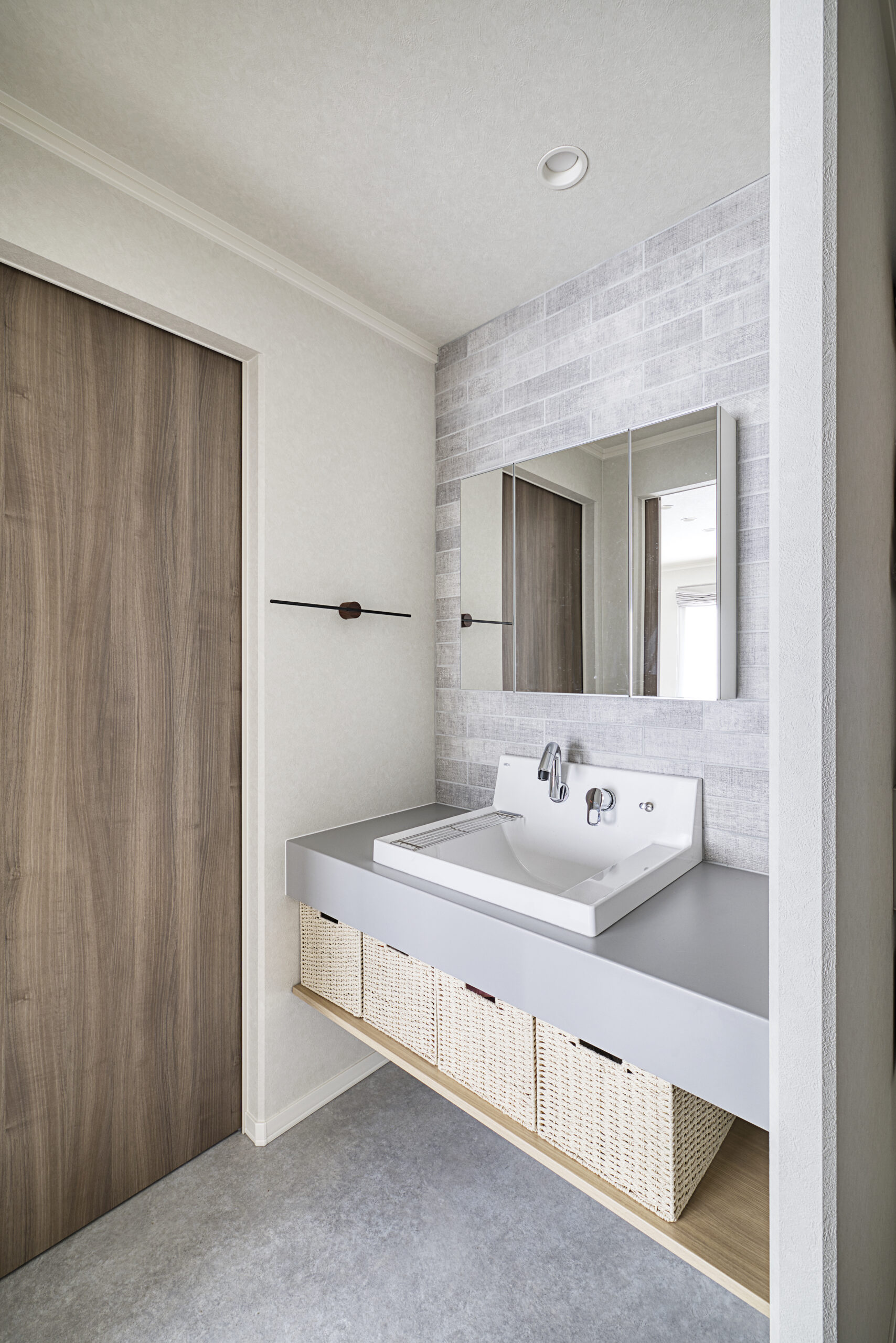 水回り動線の中核として、毎日の動きを支える洗面。家事効率を考え、使いやすさと見た目を両立した空間。
