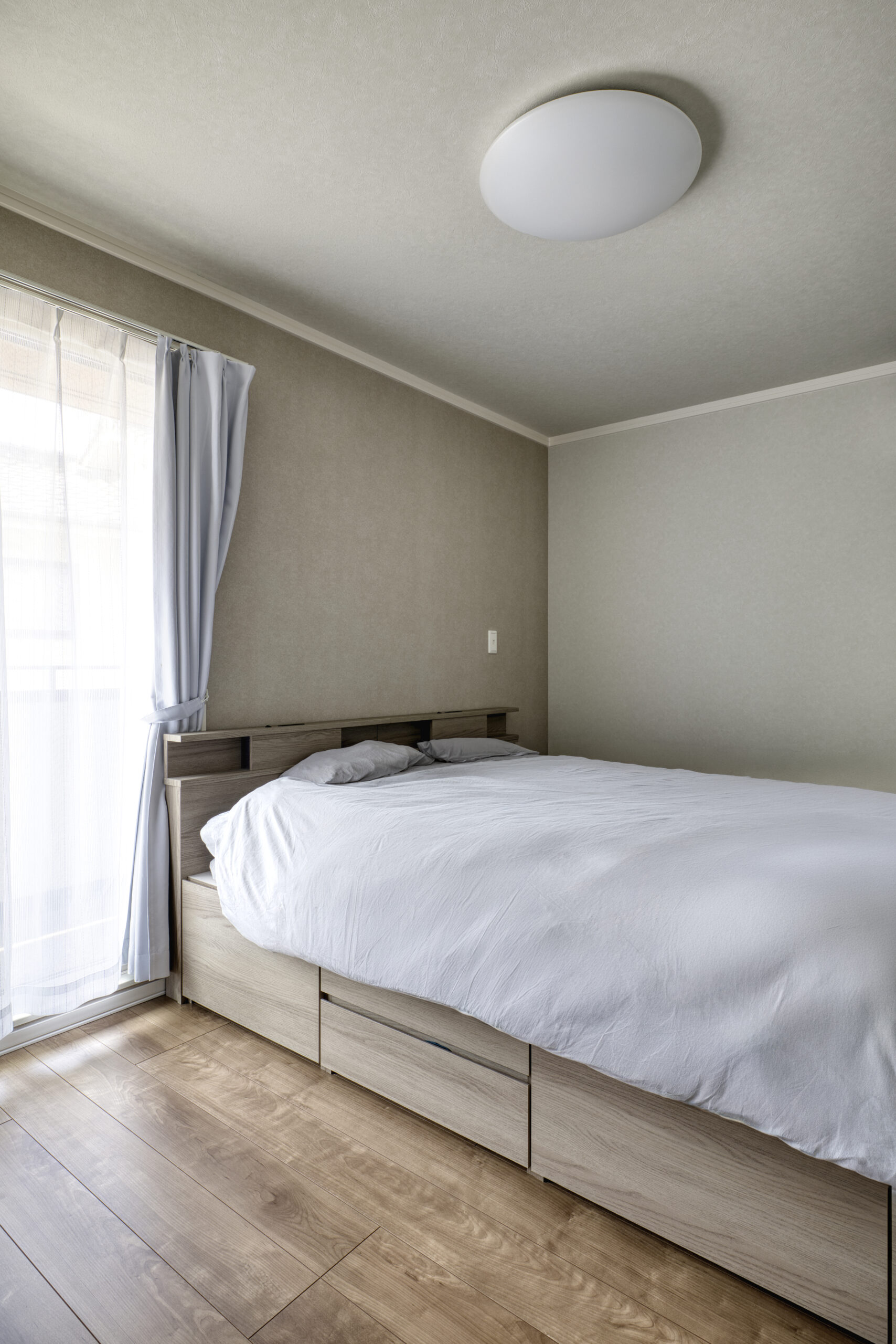 余計な装飾を省き、睡眠に集中できるようまとめたシンプルな寝室。