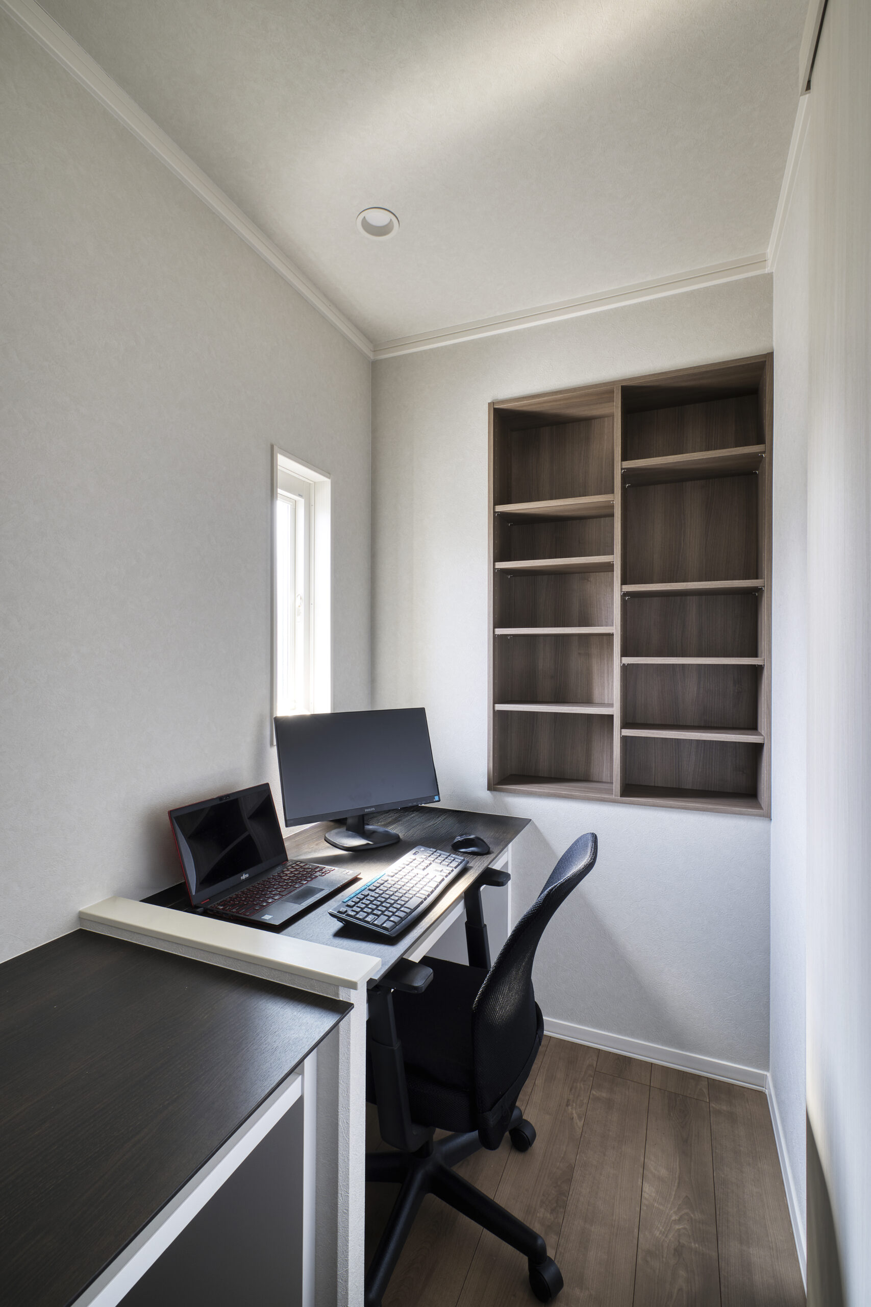収納を造作で整え、仕事や趣味に没頭できる環境をつくった書斎。主寝室の奥に設け、いつでも静かに集中できる空間です。