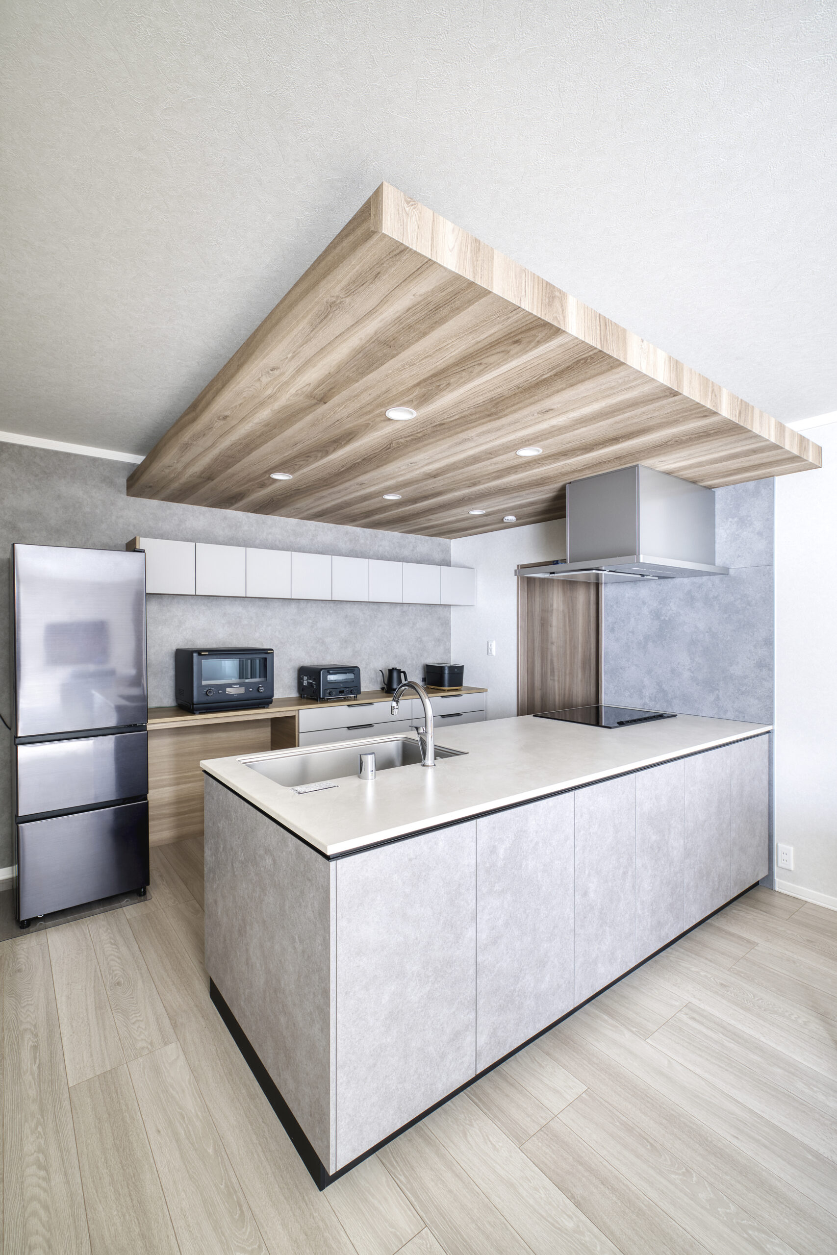 LDKの顔となるよう理想を形にした、使いやすさと見た目を両立したキッチン。間接照明が天井に柔らかな陰影を描き、キッチンの存在感を引き立てます。