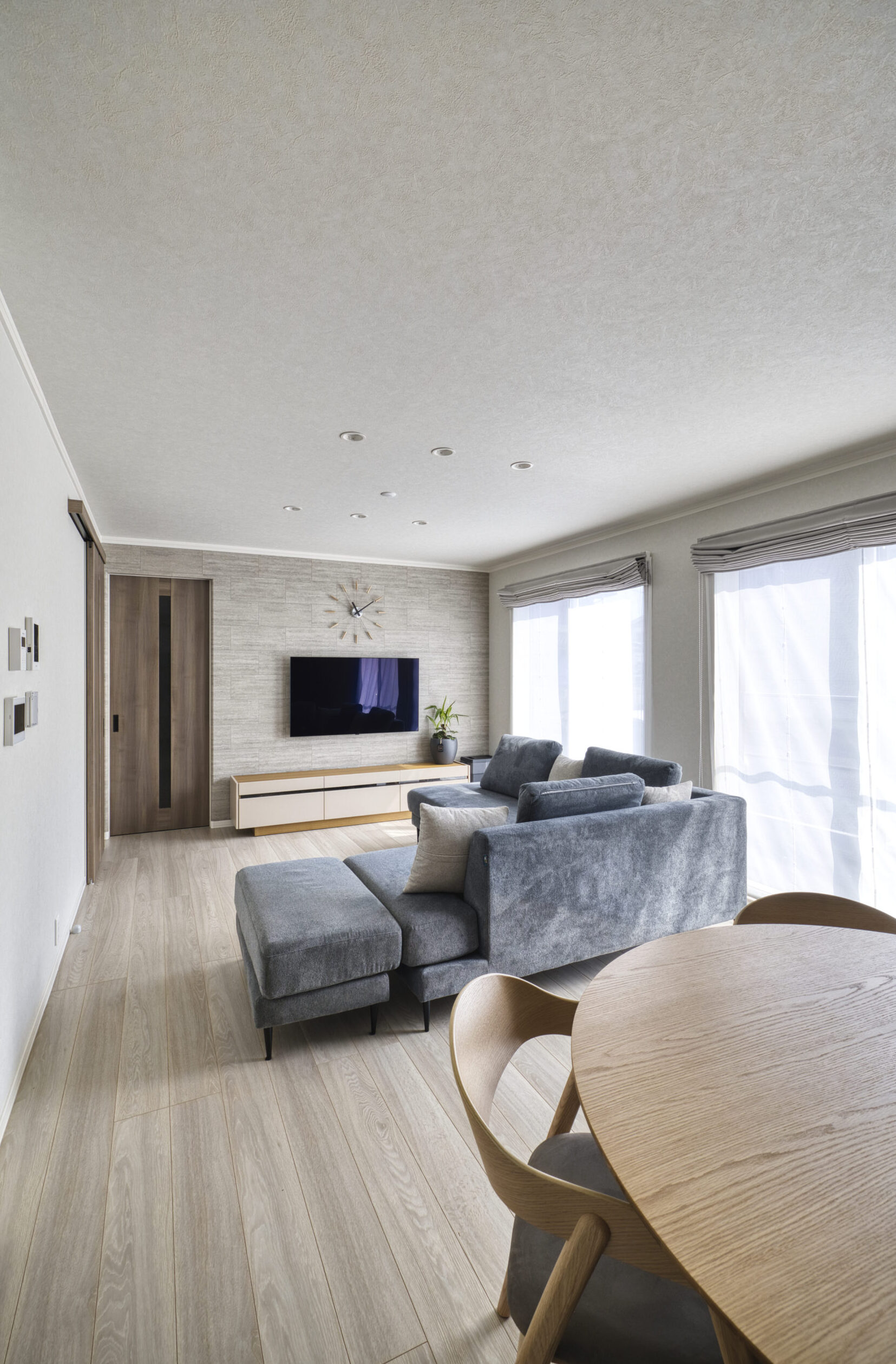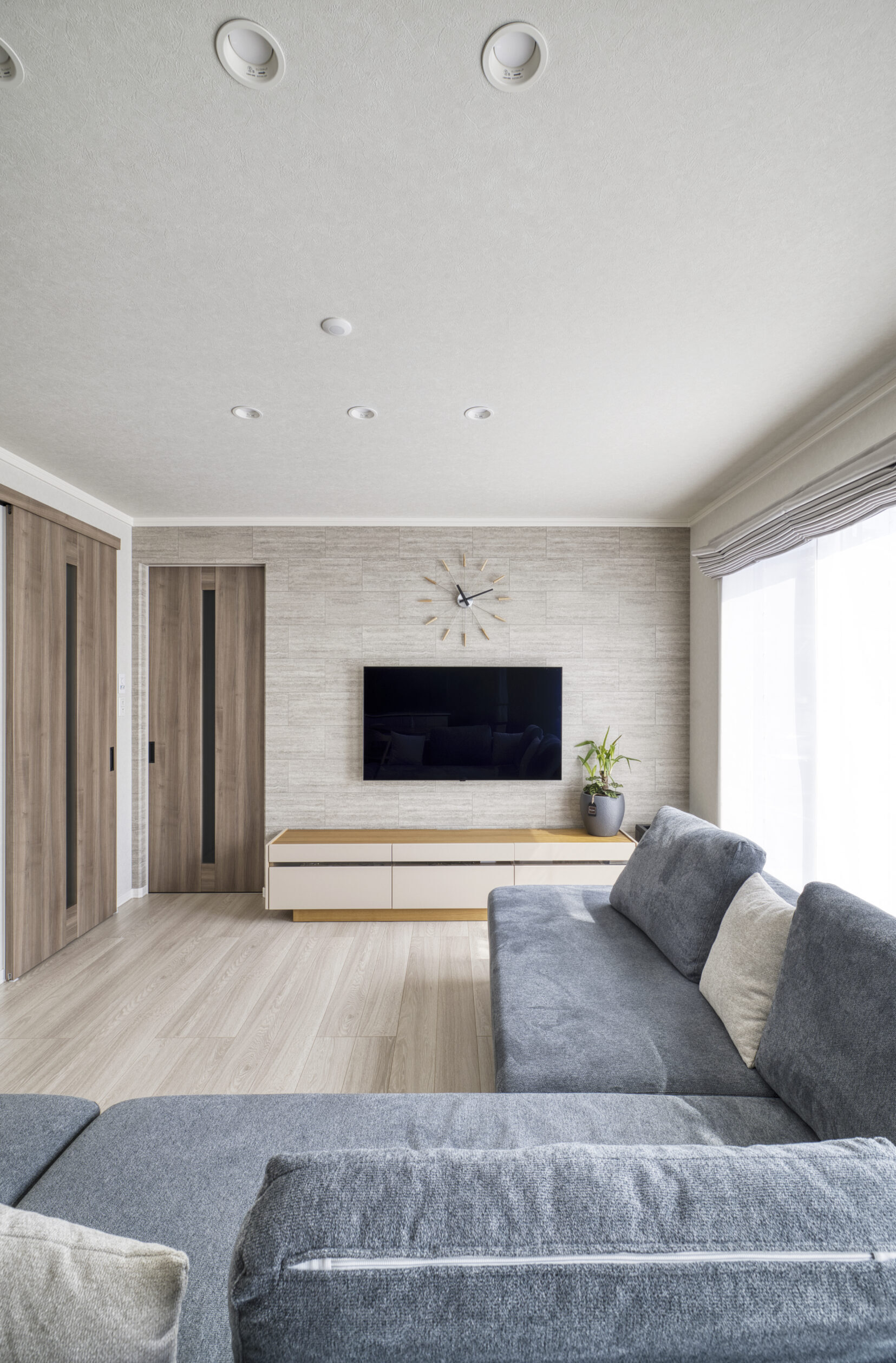 家族で過ごす時間を想定し、くつろぎやすい広さと配置を意識したリビング。テレビ背面には、空間に奥行きを与えるアクセントクロスを採用。