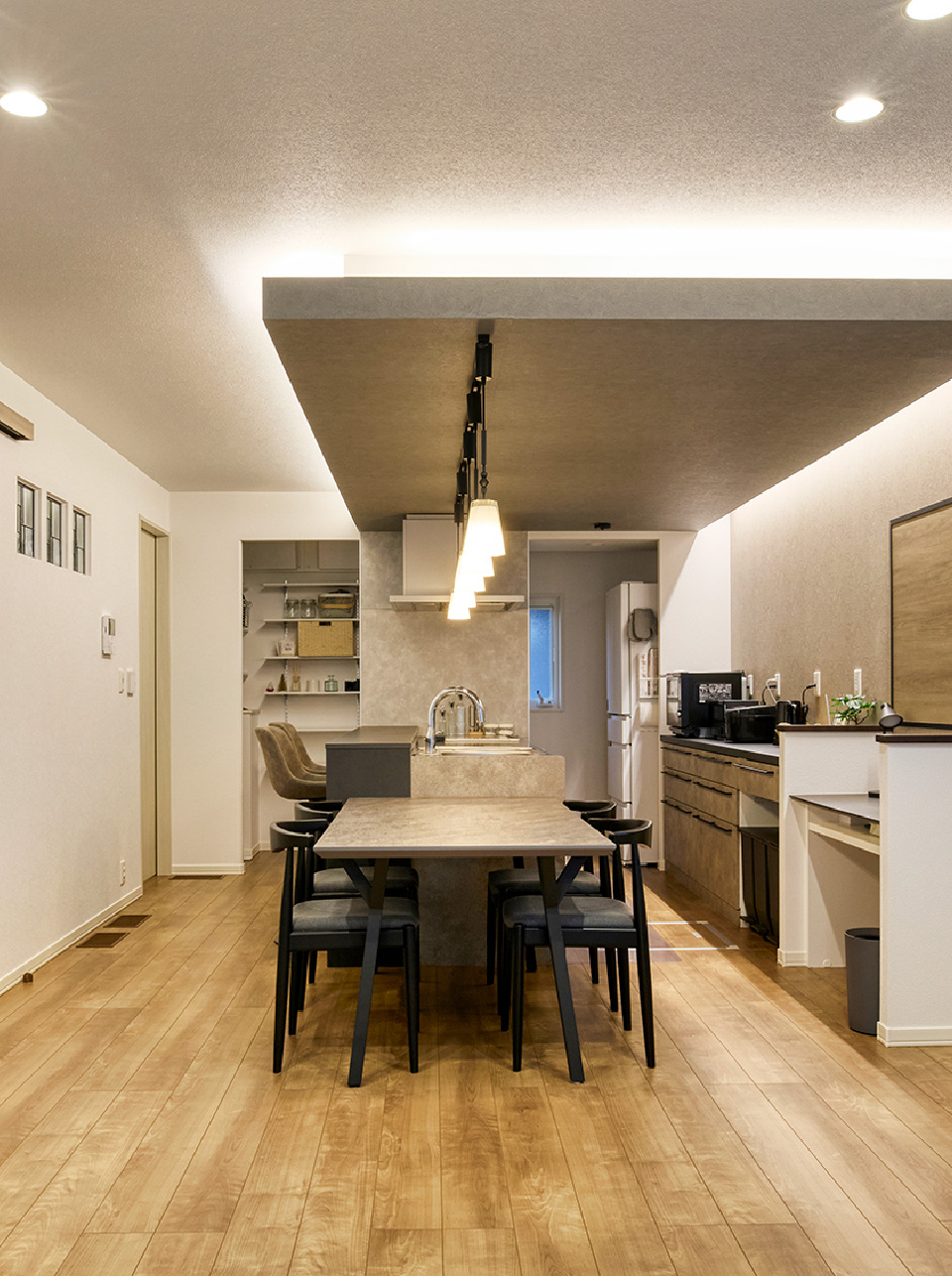 キッチンの横並びダイニング、下がり天井、そして奥行きを演出する間接照明が核となる空間。