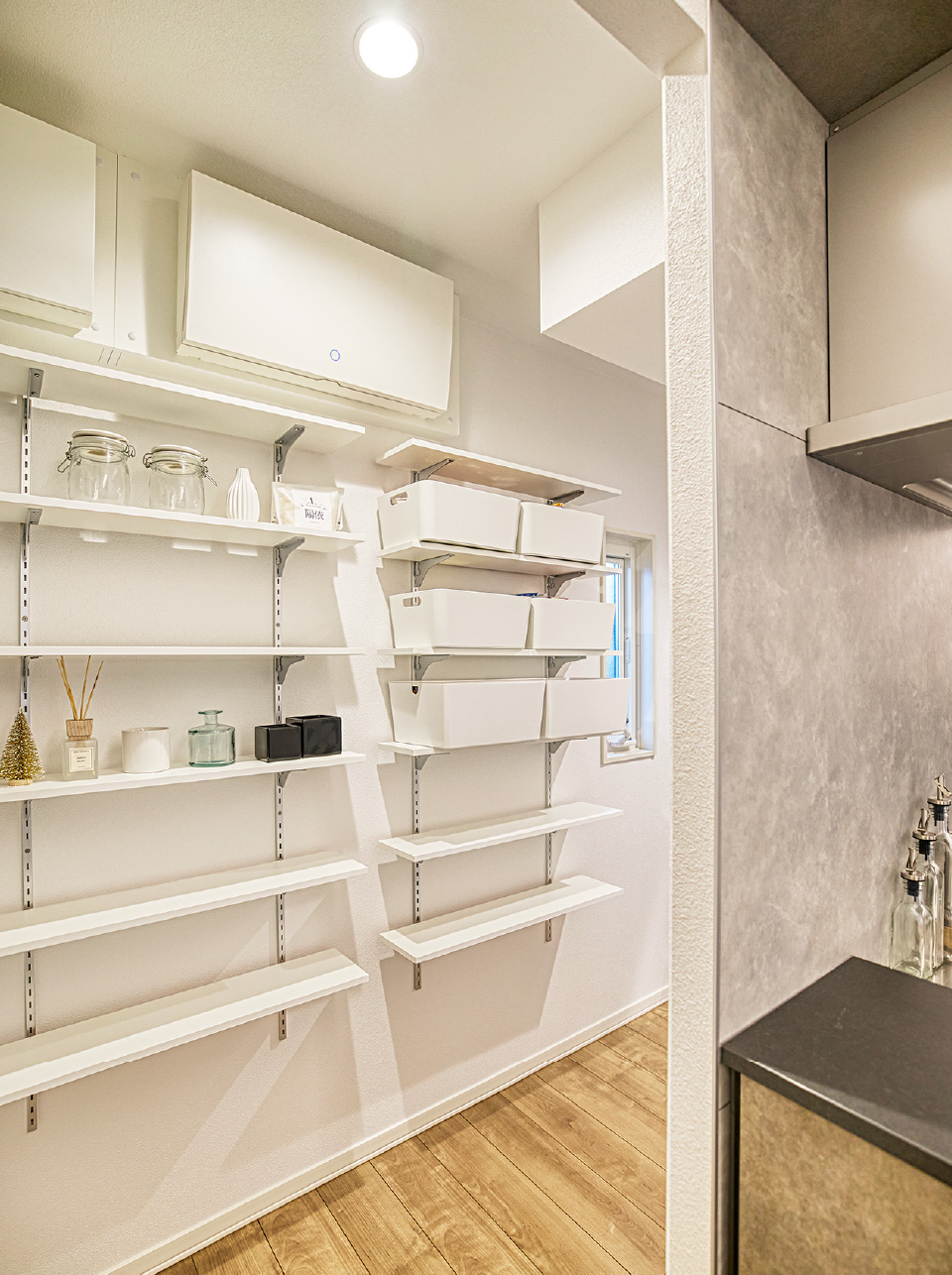 キッチンと直結した大型パントリー。棚板の高さを自由に調整できる可動棚を採用。デザインと機能性を両立させた、こだわりの収納。