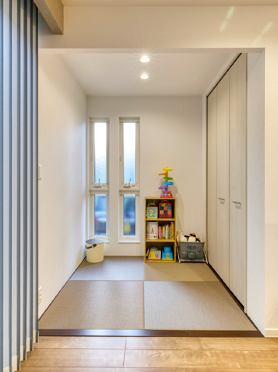 お子様の誕生をきっかけに、子育てに適した静かな環境を選ばれたご夫婦の住まい。忙しい毎日を支えるスムーズな家事動線と、天井高を高く見せる下がり天井の視覚効果でゆとりのある空間を実現。光の設計で、昼と夜で表情が変わる趣深い事例です。
