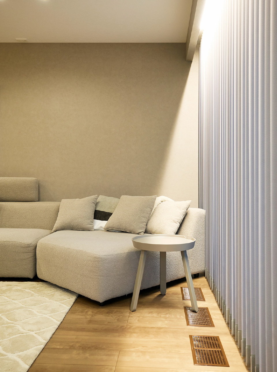 ベージュやグレーなど淡いトーンで統一。心地よい質感と光に包まれる、上質な寛ぎの空間。