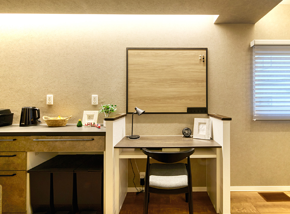 家事と仕事、子どもの学習をサポートするLDK内のカウンターデスク。木目柄マグネットボードがアクセント。機能性とデザインを両立した集中スペース。