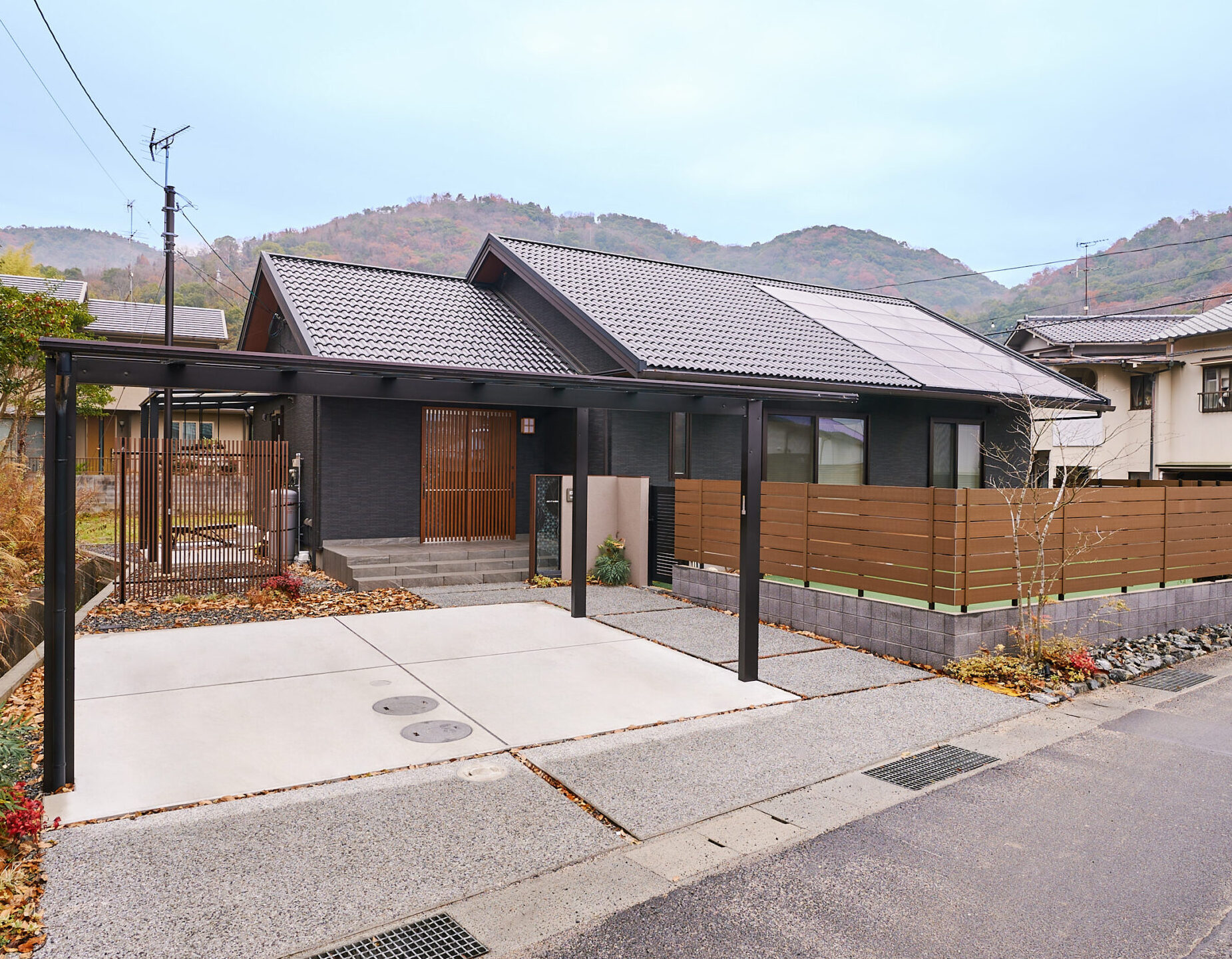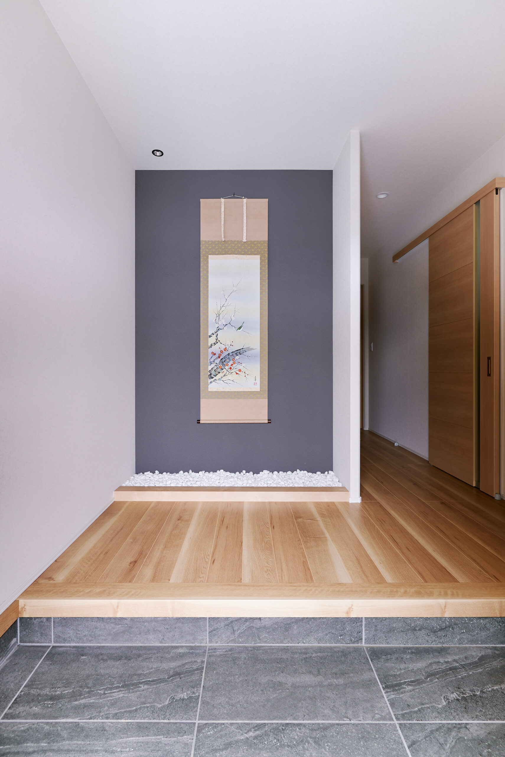 グレーのアクセント壁と砂利の質感が響き合う、日本の伝統美を現代的に表現した玄関。