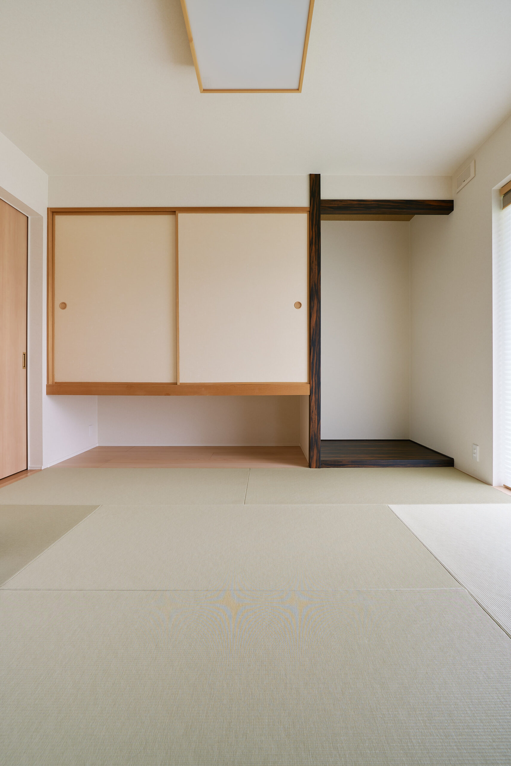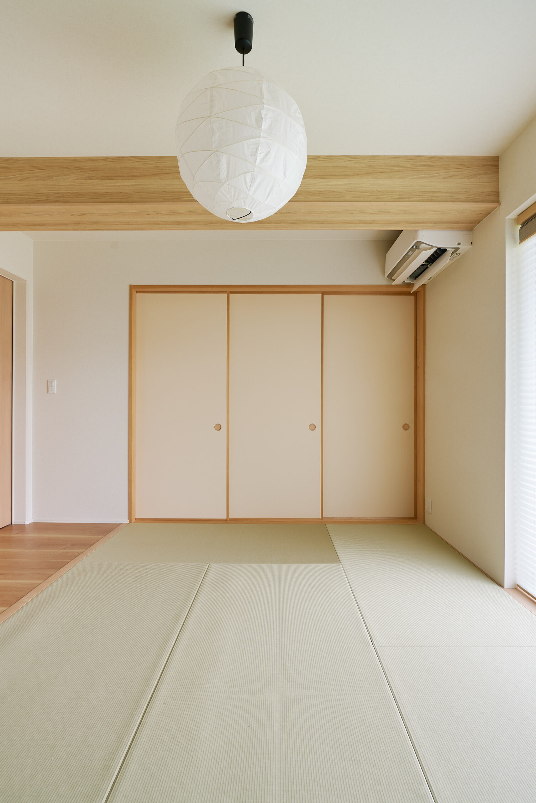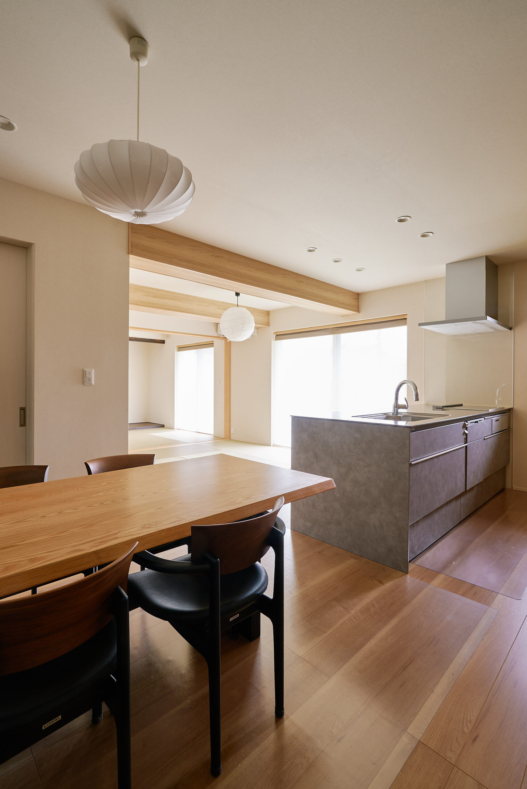 開放感とプライバシーを両立。和室とリビングを仕切れる美しい襖。構造梁を活かし、照明もバランスよく配置。