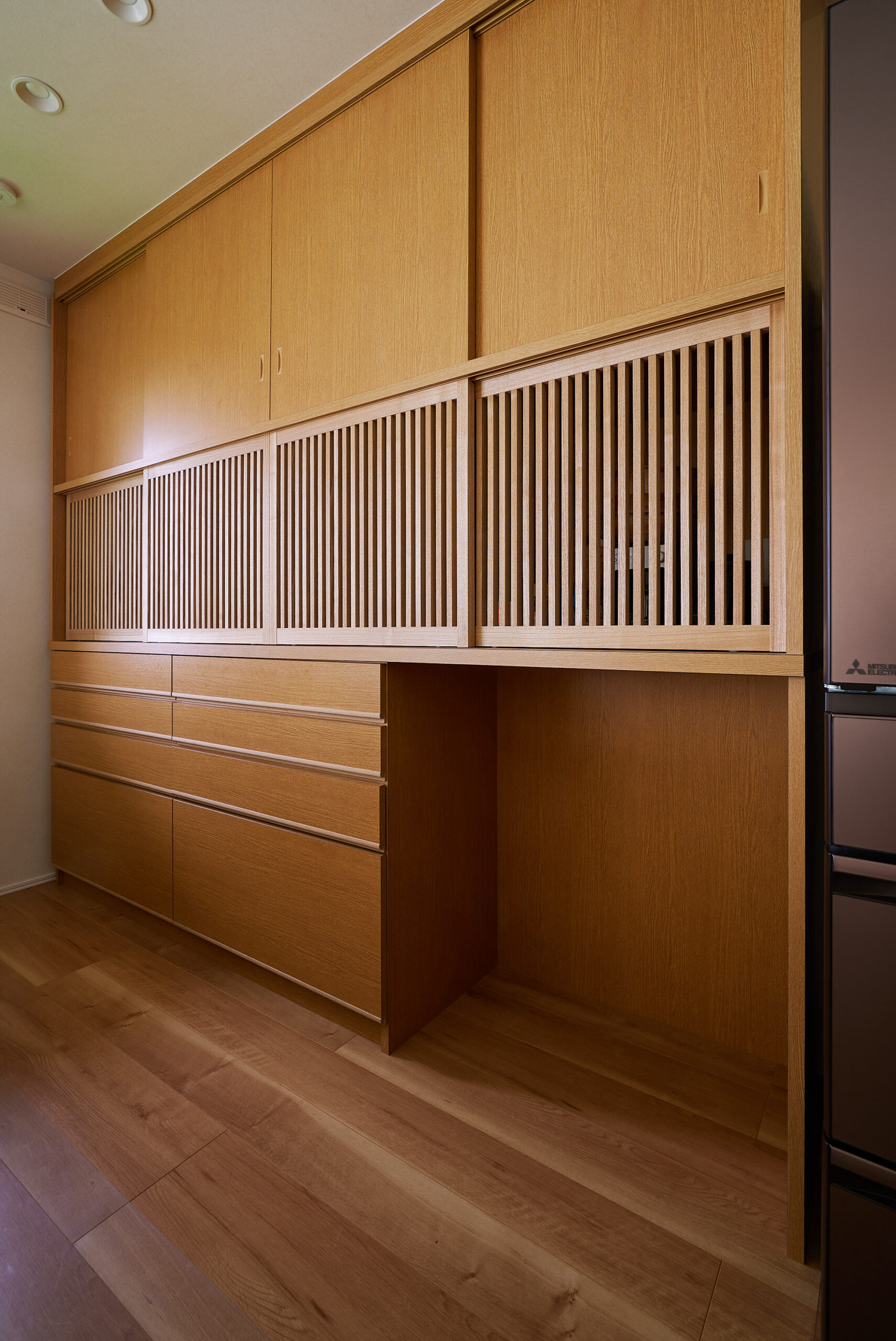 キッチンから収納まで木目で繋ぐ。縦格子のリズムが心地よい、大容量の壁面造作収納。