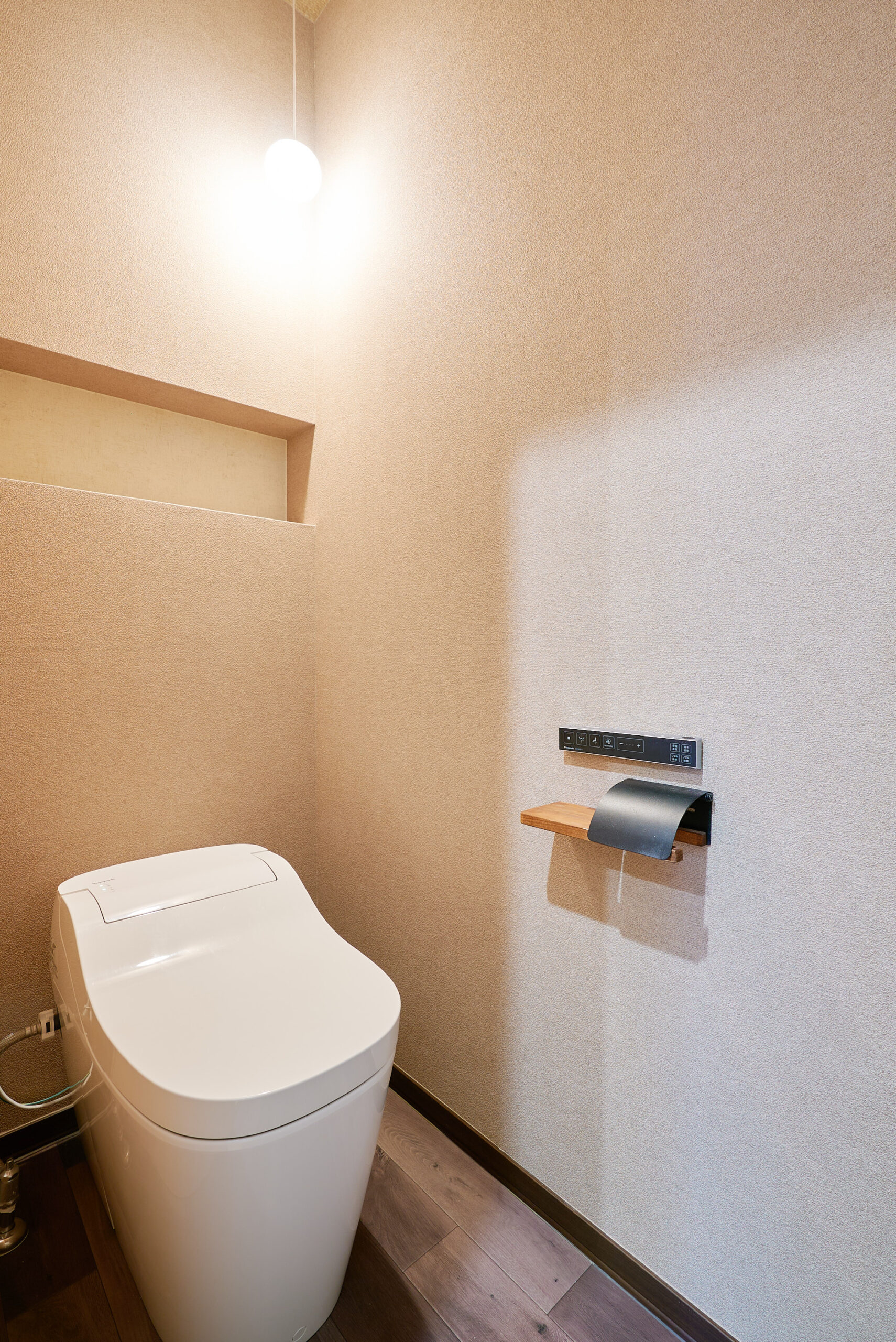 落ち着いたクロスに木目の温もりをプラス。シンプルだからこそ素材の良さが際立つ、美しきトイレ空間。
