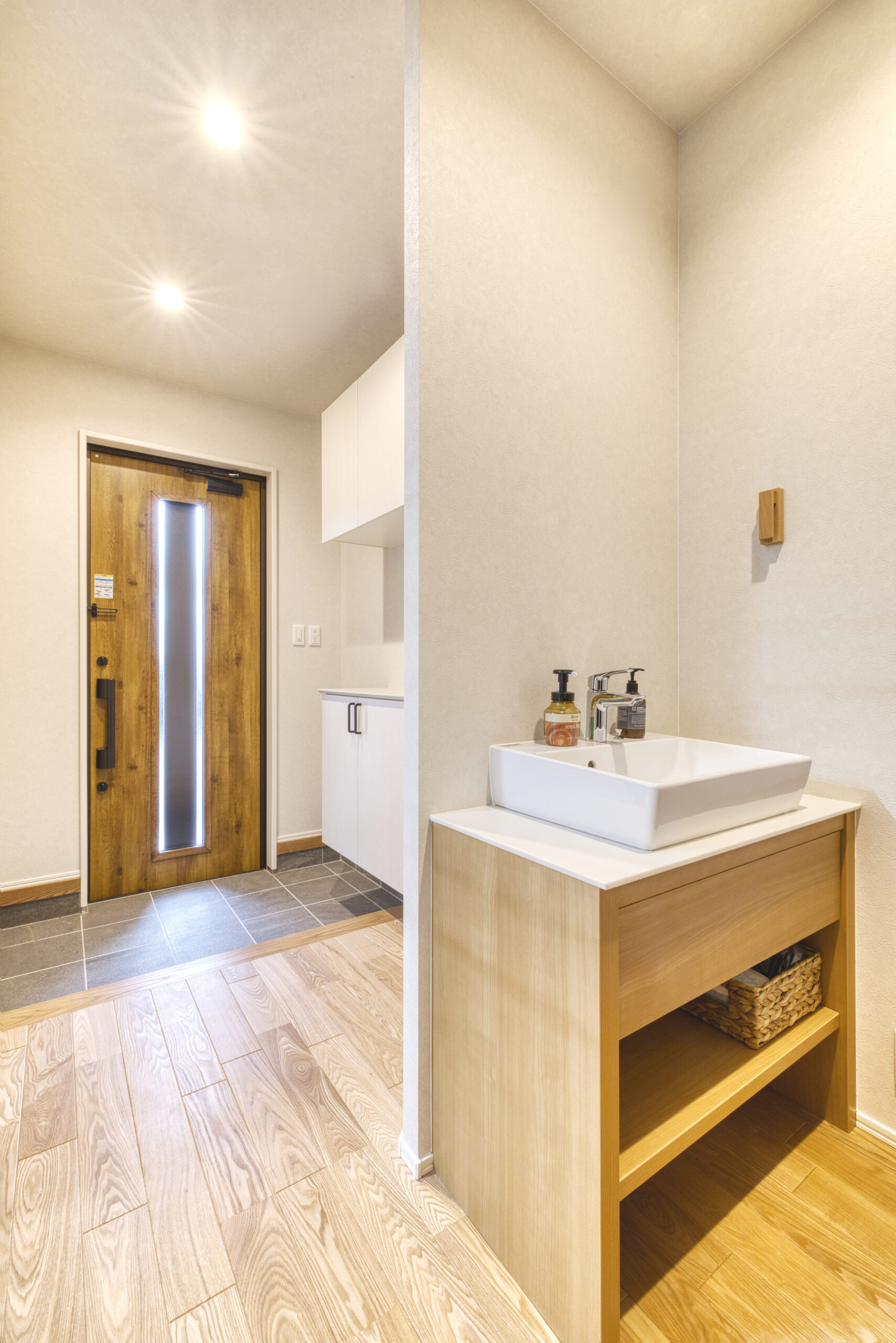 帰宅動線がスマートな位置に設置された洗面化粧台。家具のような木目調の洗面台で、インテリアの一部として美しく玄関ホールに馴染みます。