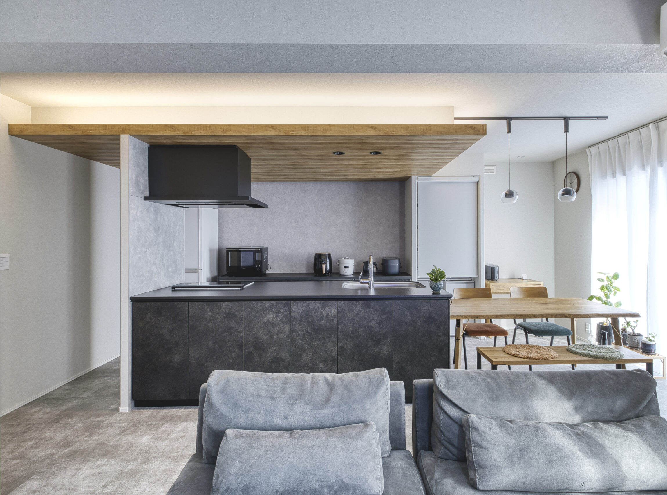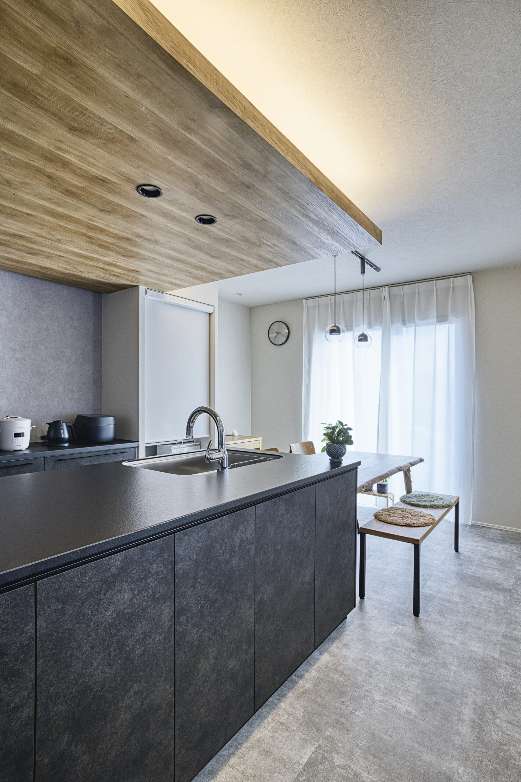 重厚感のあるブラックのアイランドキッチンに柔らかな朝の光が注ぐ。収納も兼ね備えたワークトップを活かし、いつでも整った空間に。