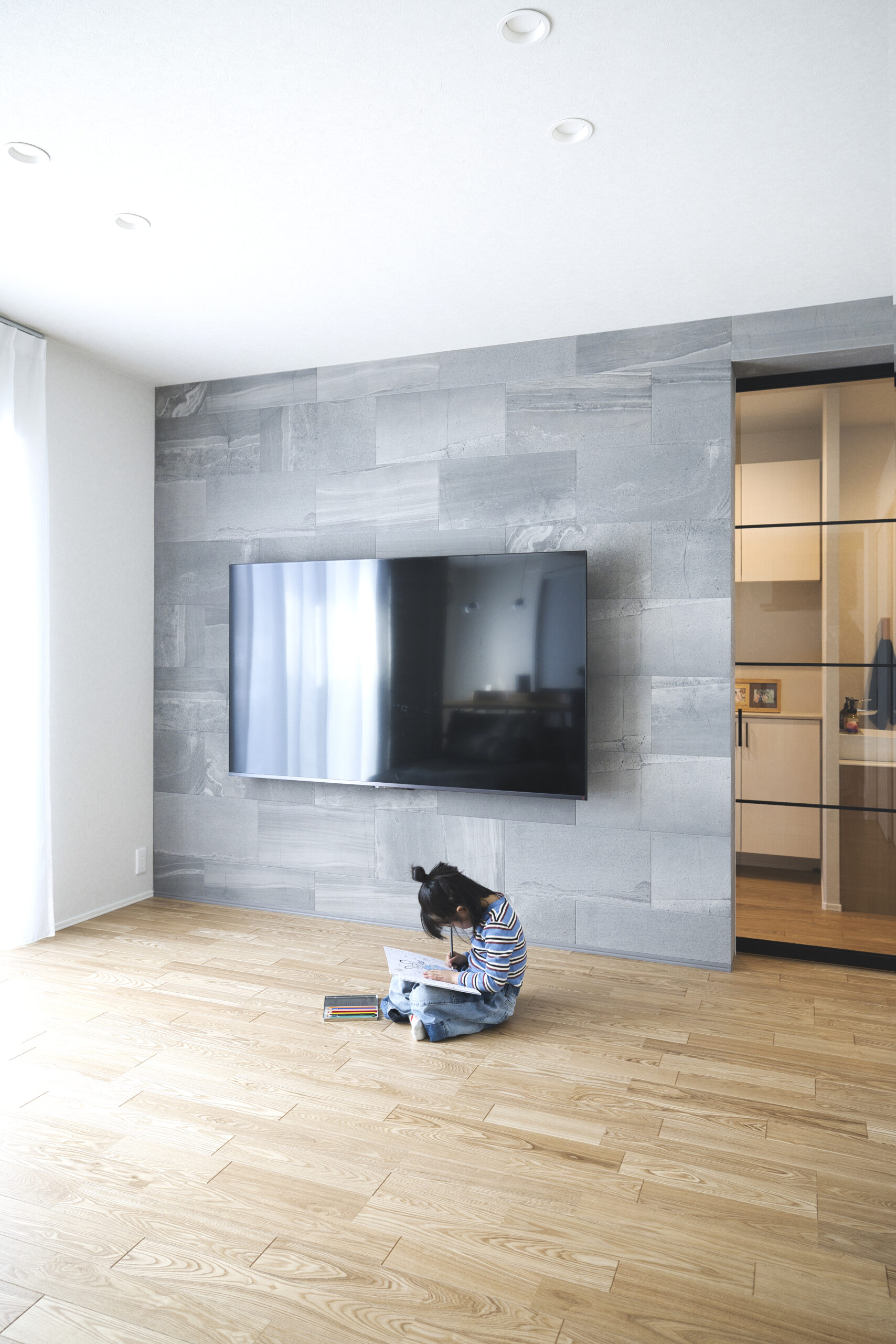 石目調のエコカラットプラスが圧倒的な存在感を放つリビング。お子様ものびのび遊べる寛ぎの空間。