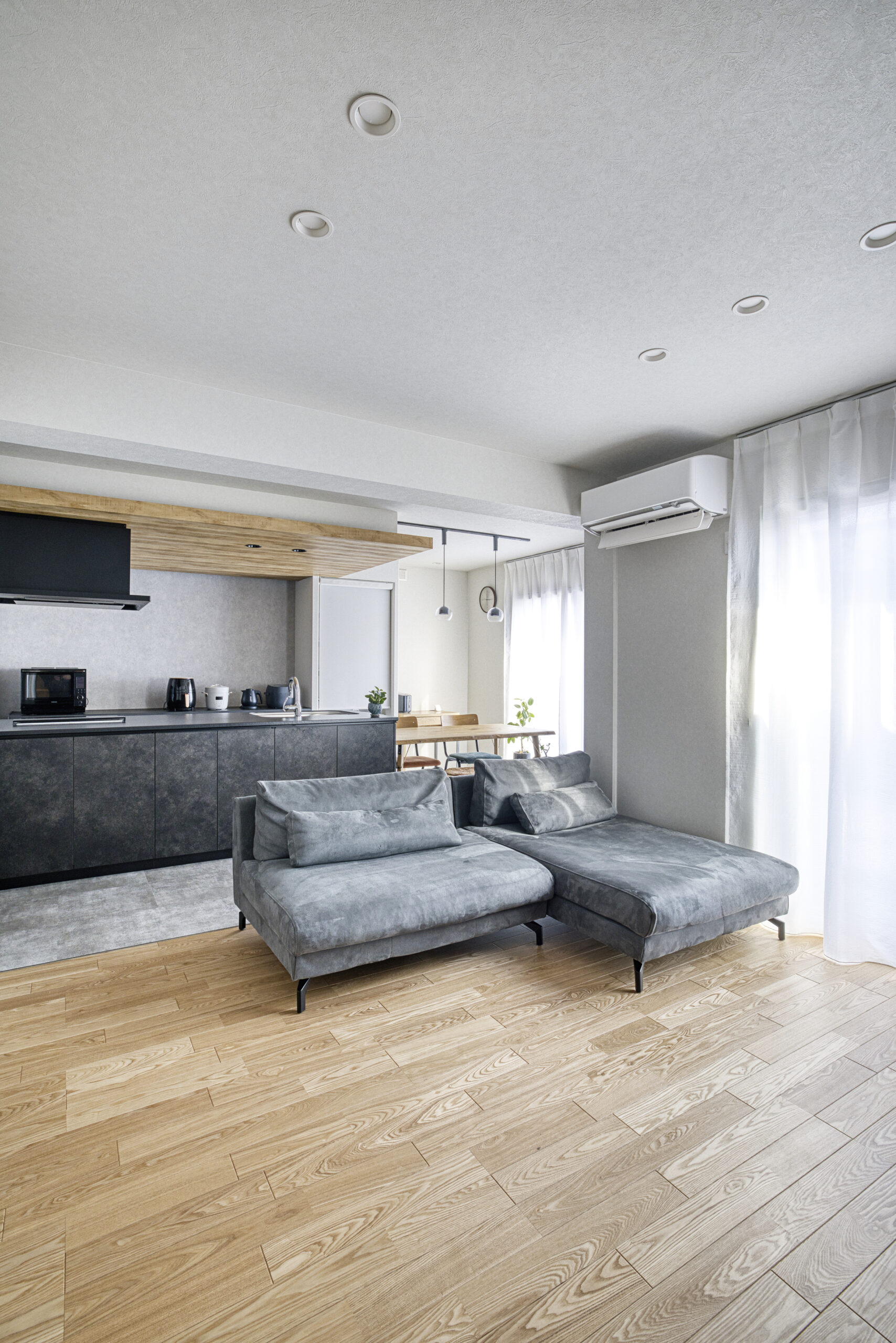 窓からの採光を最大限に活かした設計。木の温もりを感じるナチュラルなフローリングと、キッチンの床はフロアタイルを貼りコントラストを楽しむ空間に。