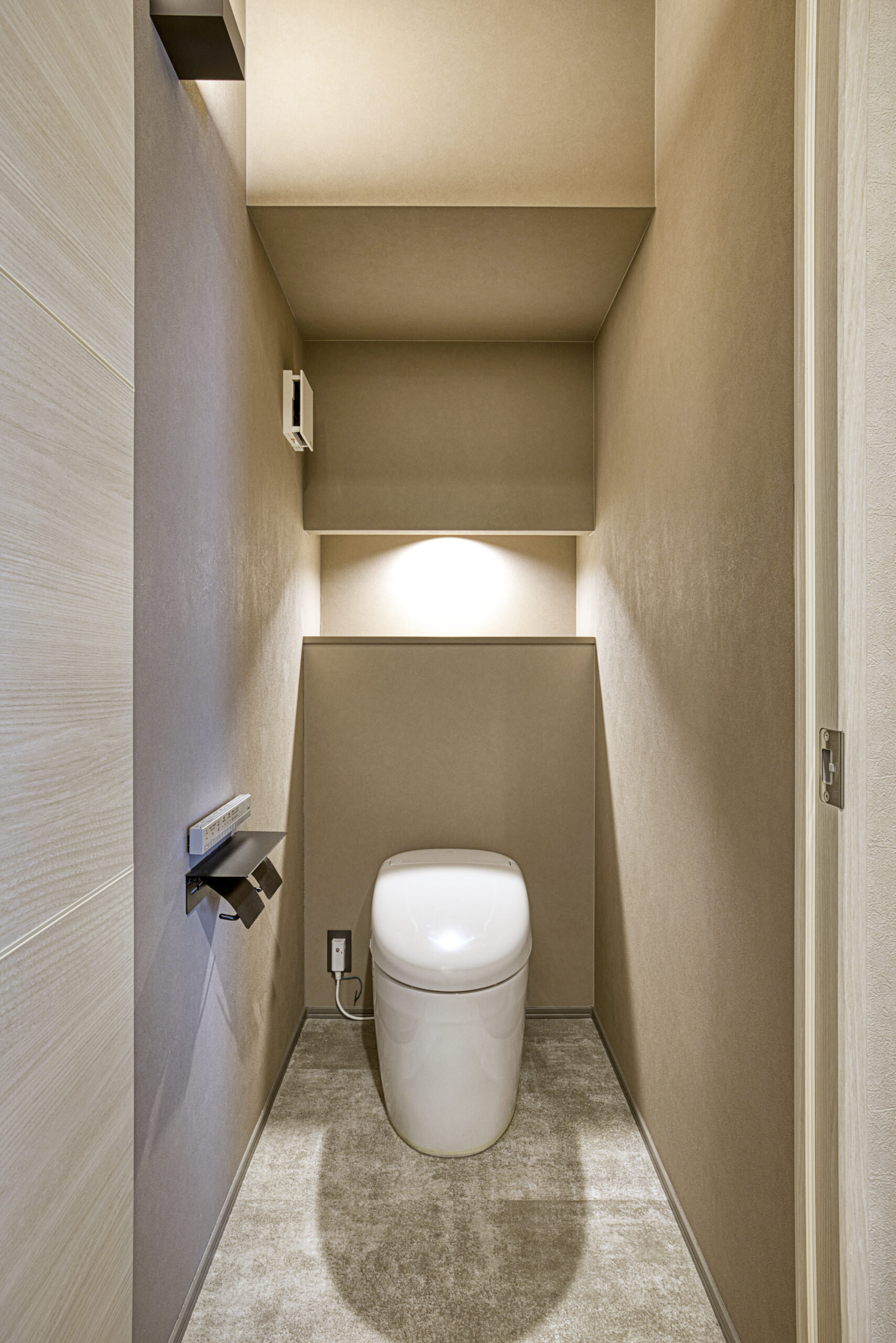 階段下のスペースを有効活用したトイレ。間接照明により、階段下でありながらも、圧迫感のない落ち着いた空間を演出。