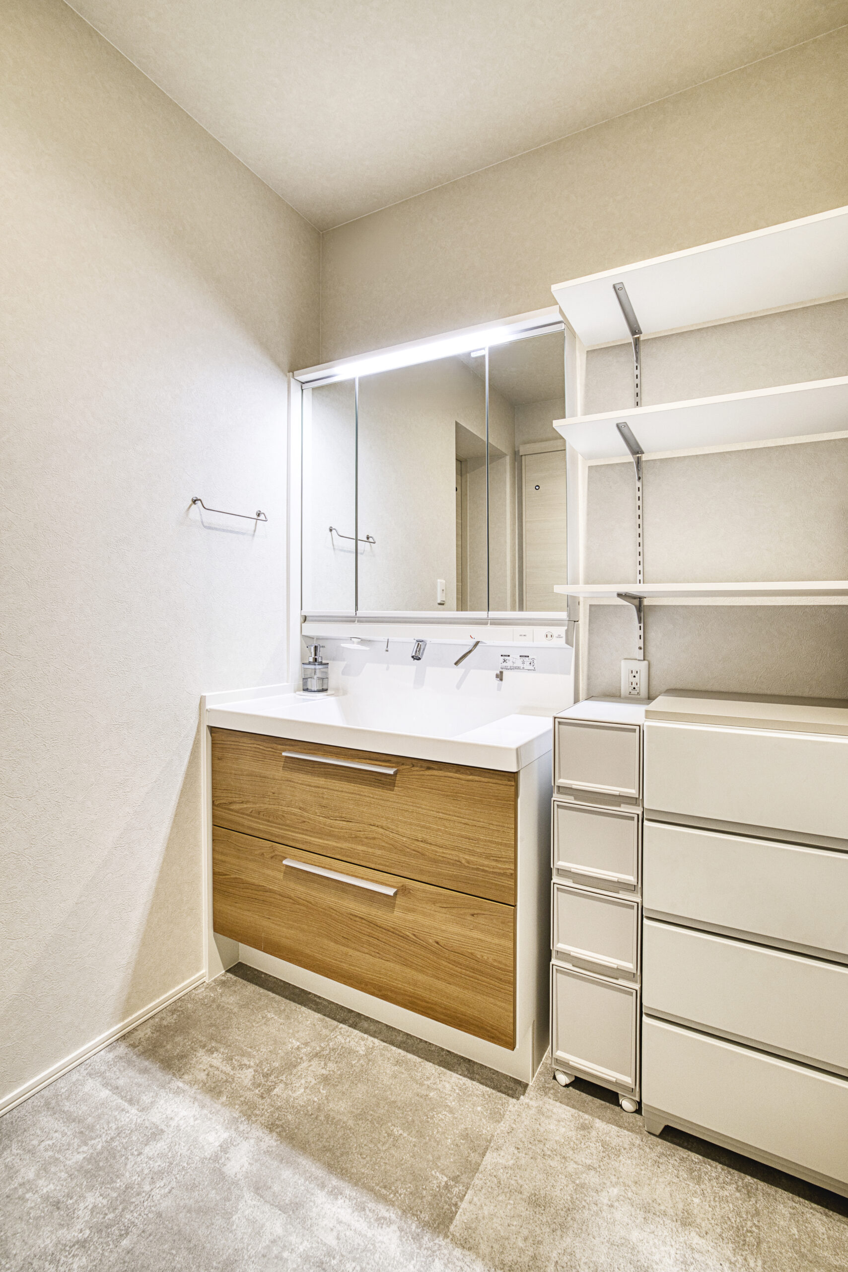 白を基調とした空間に収納扉の木目が映える、ナチュラルで清潔感のある洗面空間に。