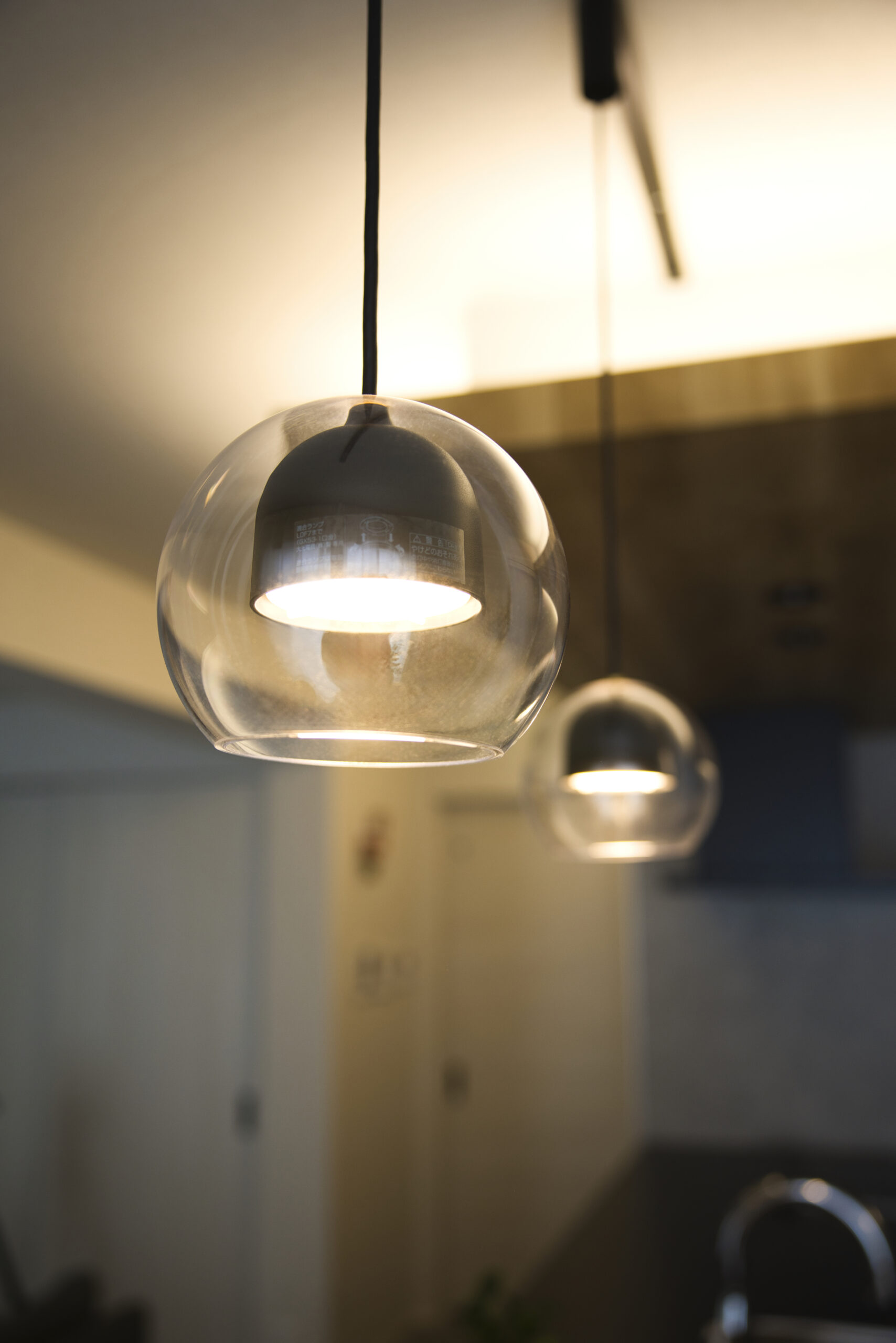 ダイニングに浮かぶ、ガラスの気泡のような美しいペンダントライト。夜は昼と違う雰囲気を楽しみます。