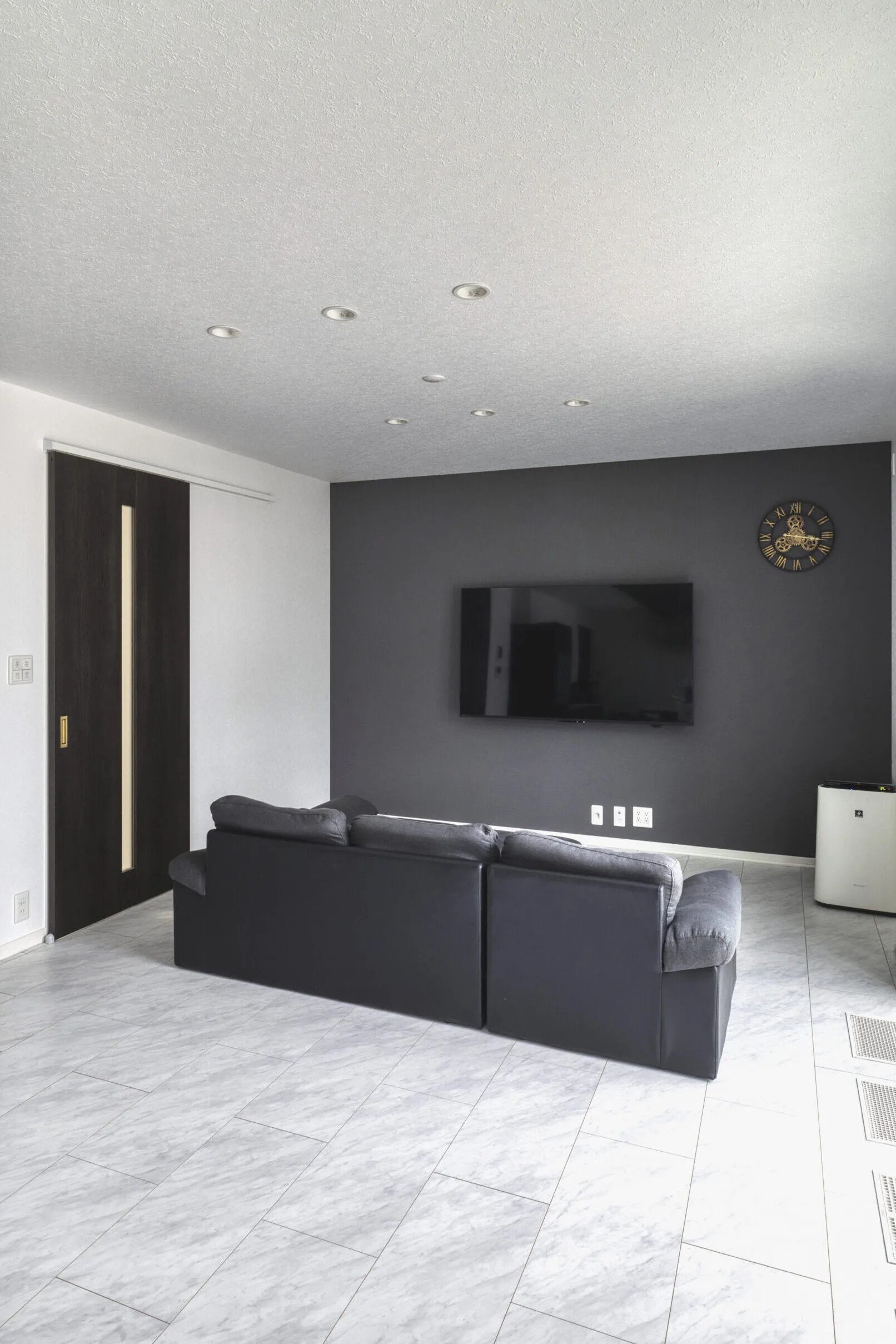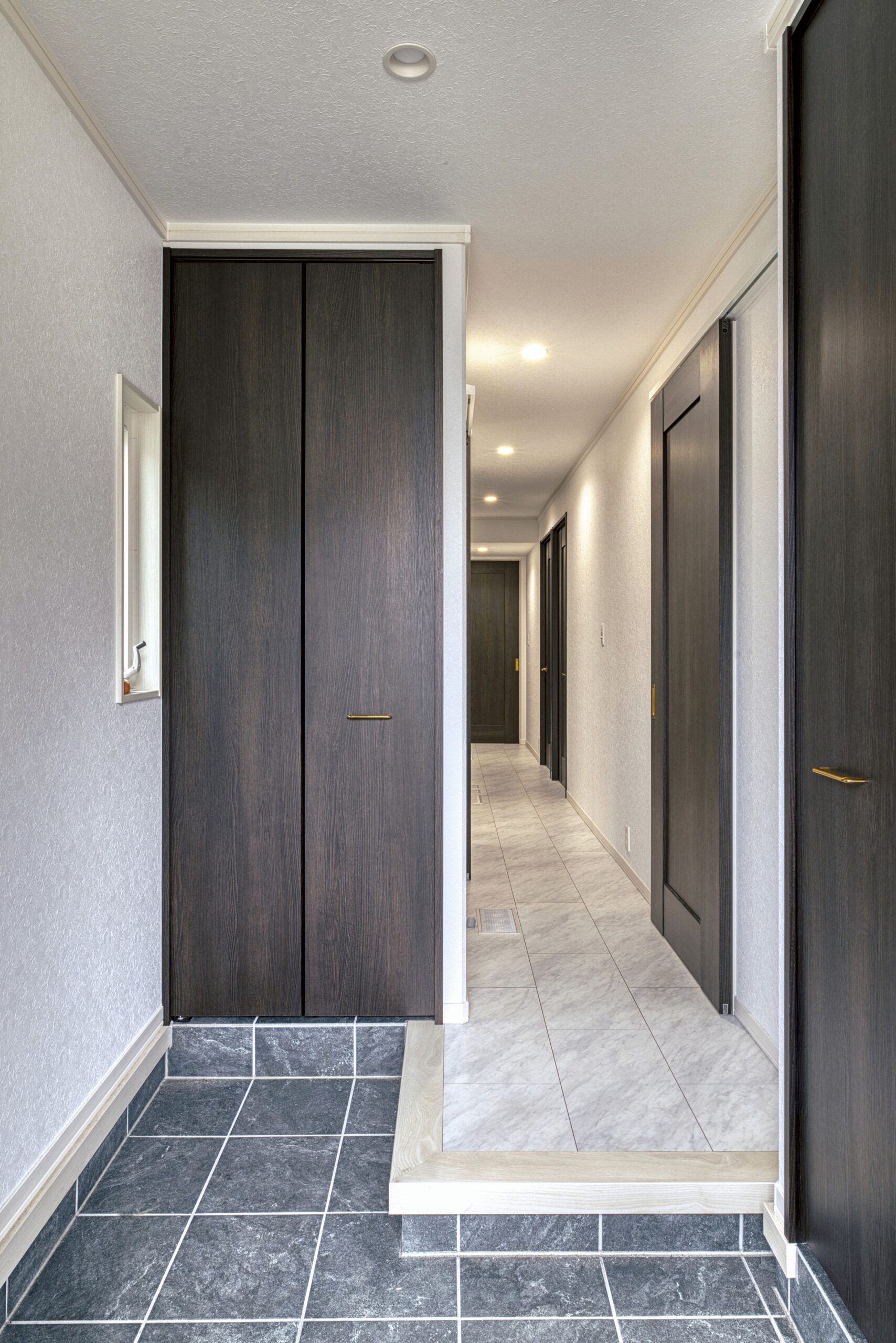 扉を開けた瞬間、床材が放つ大理石調の光沢に目を奪われる。ダークトーンの建具が空間を引き締め、ギャラリーのような凛とした空気感を演出。