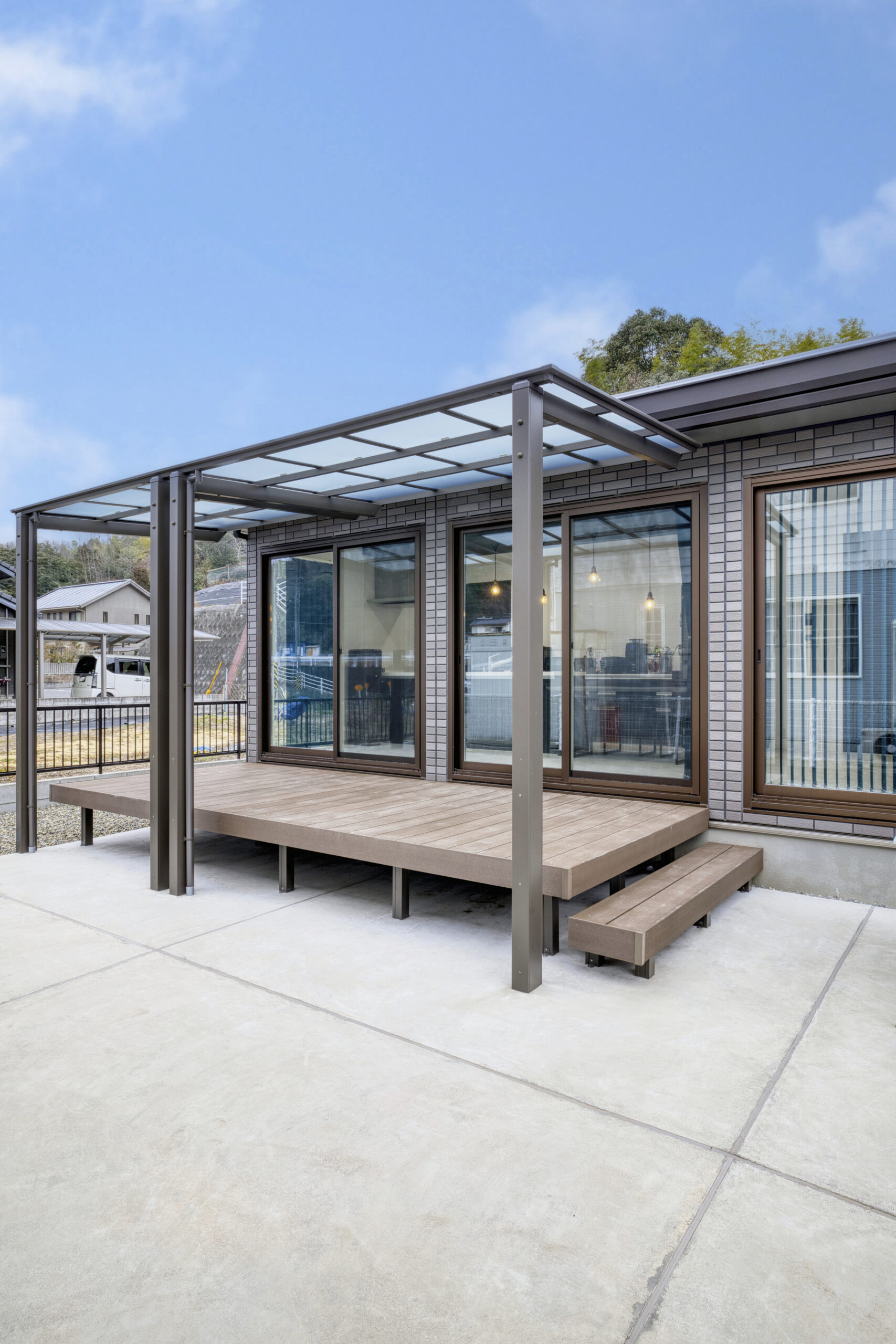 モノトーンの外観に馴染む、ウッドデッキ。平屋の佇まいにさらなる奥行きと庭の解放感をプラス。