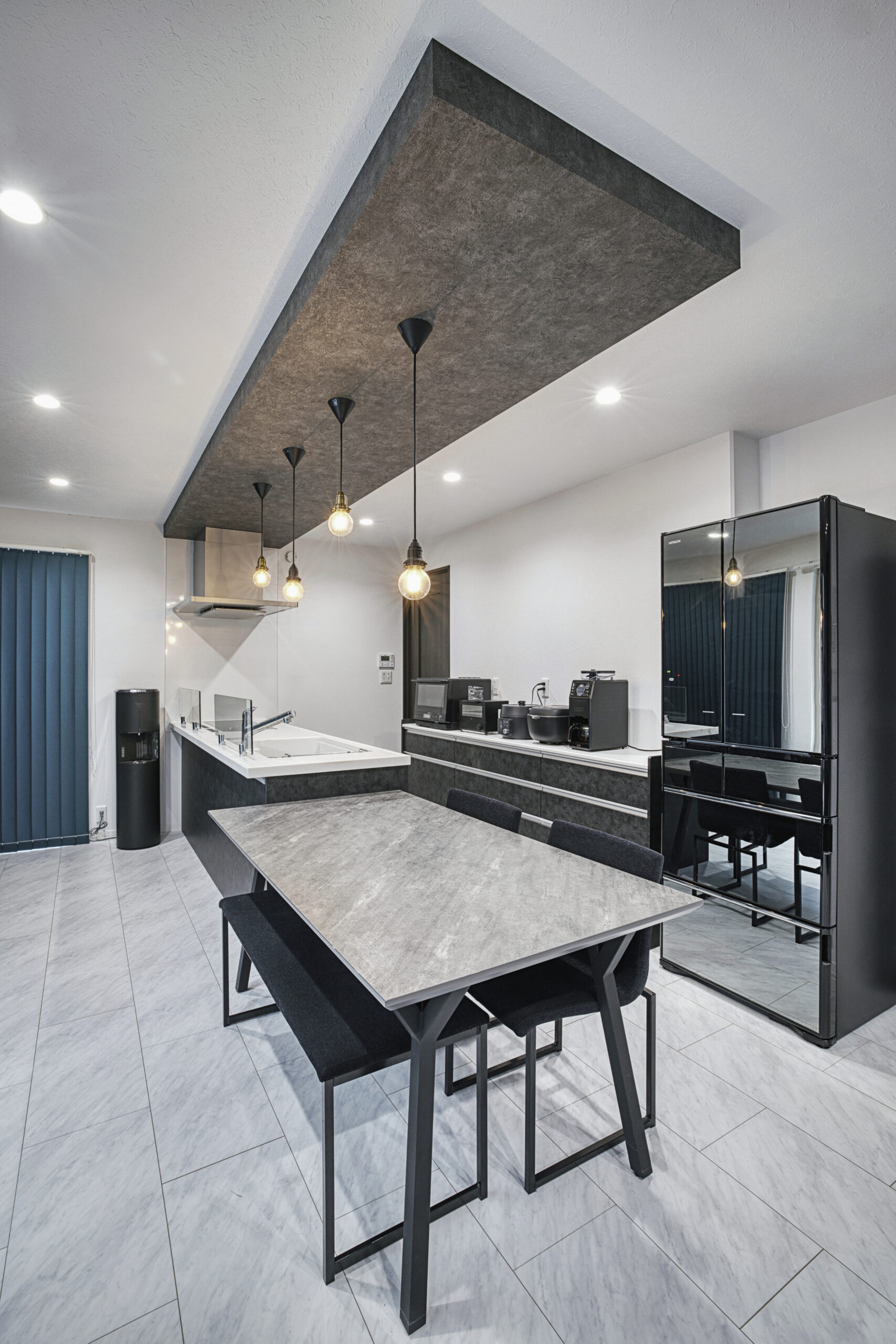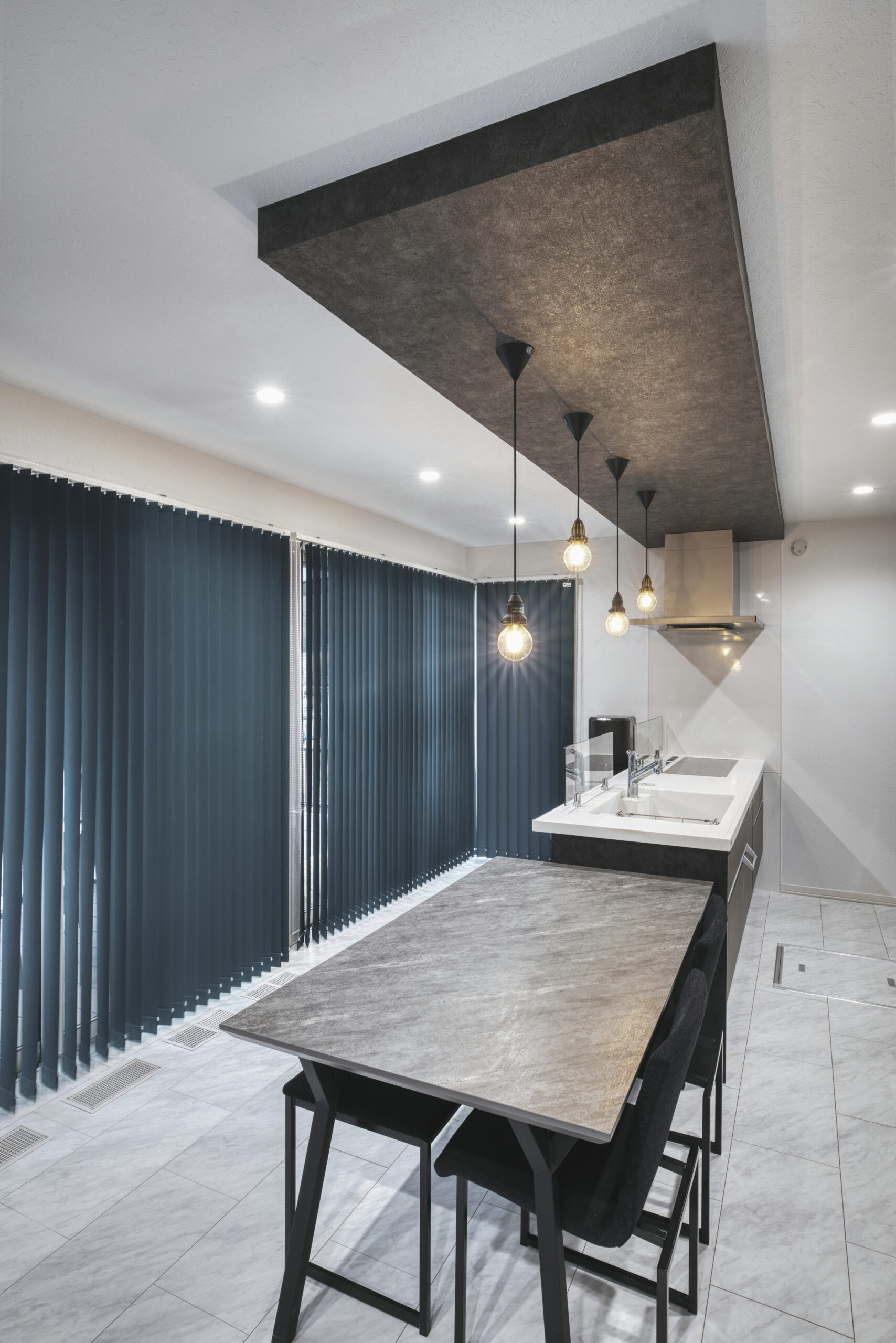 質感豊かなモノトーンで統一された、都会的で洗練されたキッチン。ペンダント照明をリズミカルに配置しアクセントに。