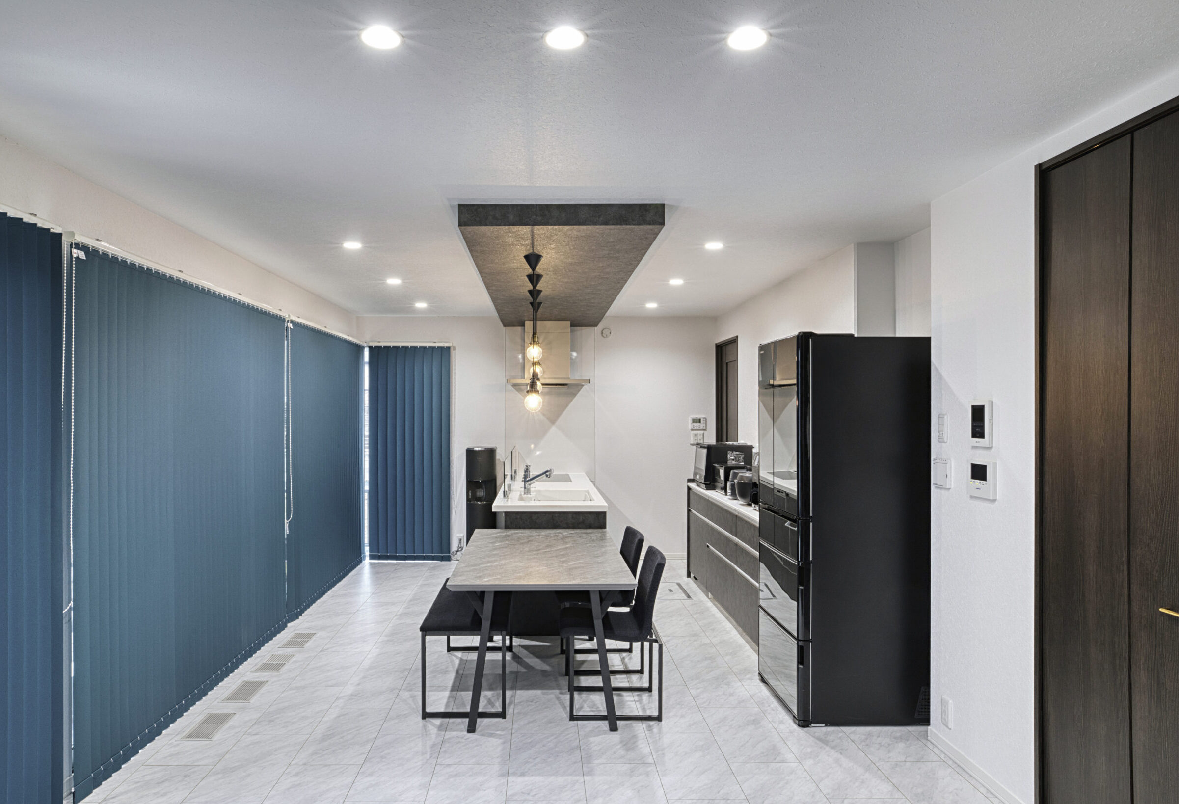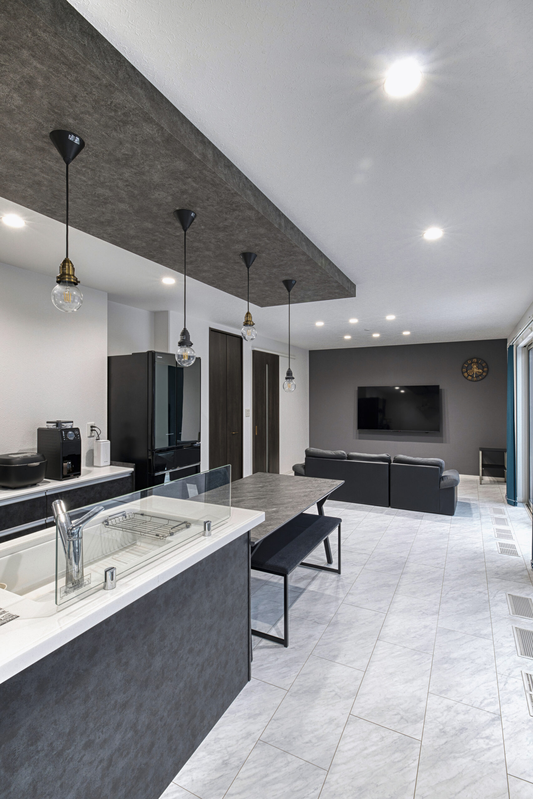 将来を見据え、資産としての平屋づくりを決意されたご夫婦。ワンフロアの特性を活かした最短の動線設計と、全面窓から日光が注ぐ開放的なリビングを実現しました。モノトーンの空間に、アクセントクロスやダークカラーのブラインドをプラスし、