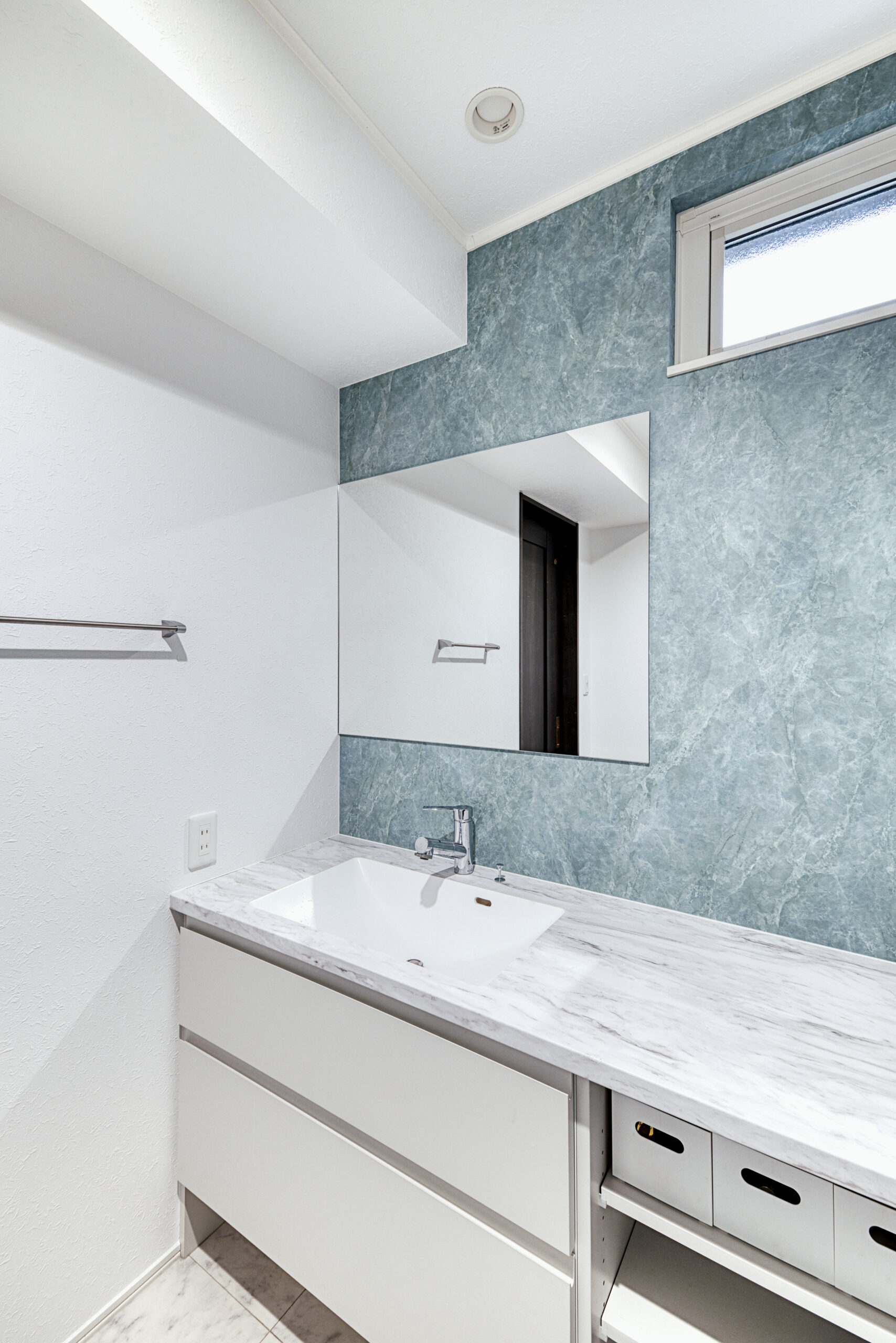 ブルーのアクセントクロスが映える洗面。白黒を基調とした内装としたが、ここだけは奥様の好きな色をアクセントとして採用。視覚的な心地よさと使い勝手の良さを追求し、生活の質を細部から高める設計に。