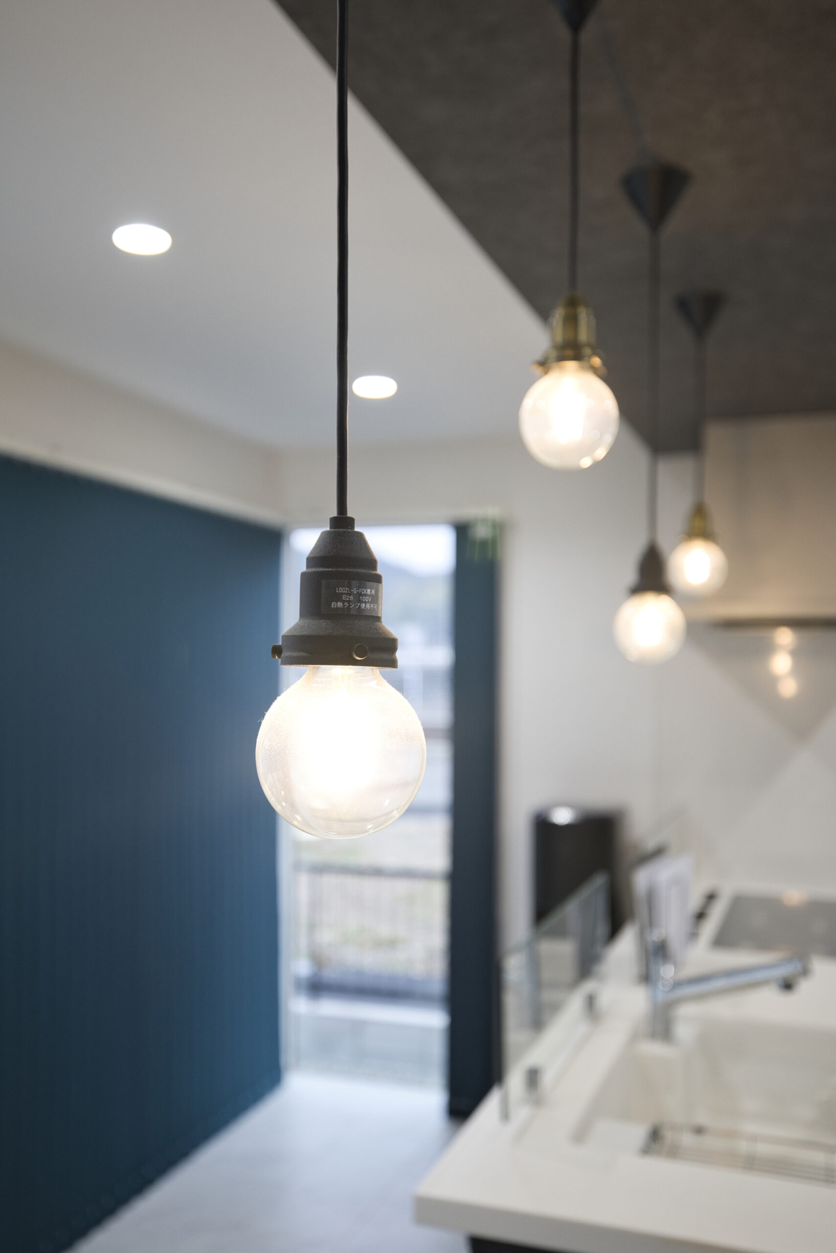 高さを変えた、空間にアクセントを与えるペンダントライト。空間の質感を際立たせる「光のインテリア」として機能。