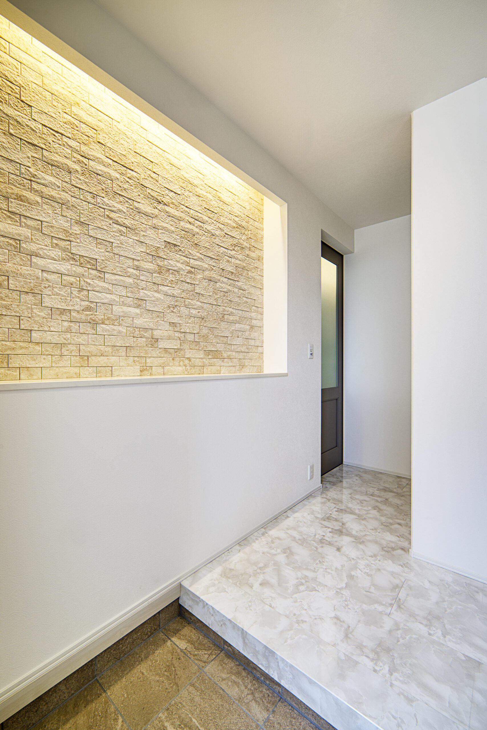 贅沢に使用したエコカラットプラスの質感が、住まいの第一印象に落ち着きと心地よさを添える玄関。