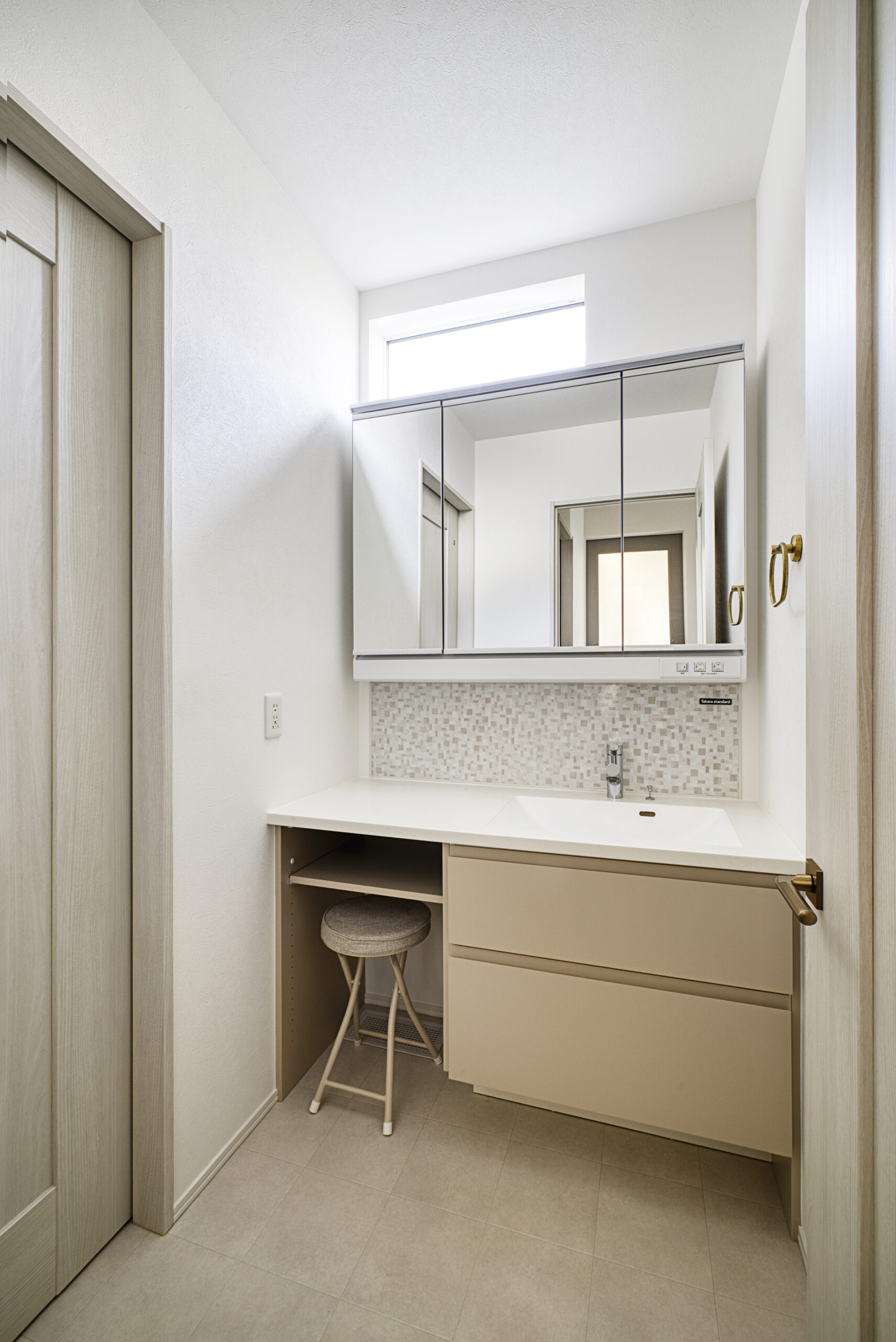 収納を造作でまとめ、棚を置かず空間をすっきり保てる洗面。帰宅後すぐ使える位置に設け、リビングを通らず身支度できる洗面動線。