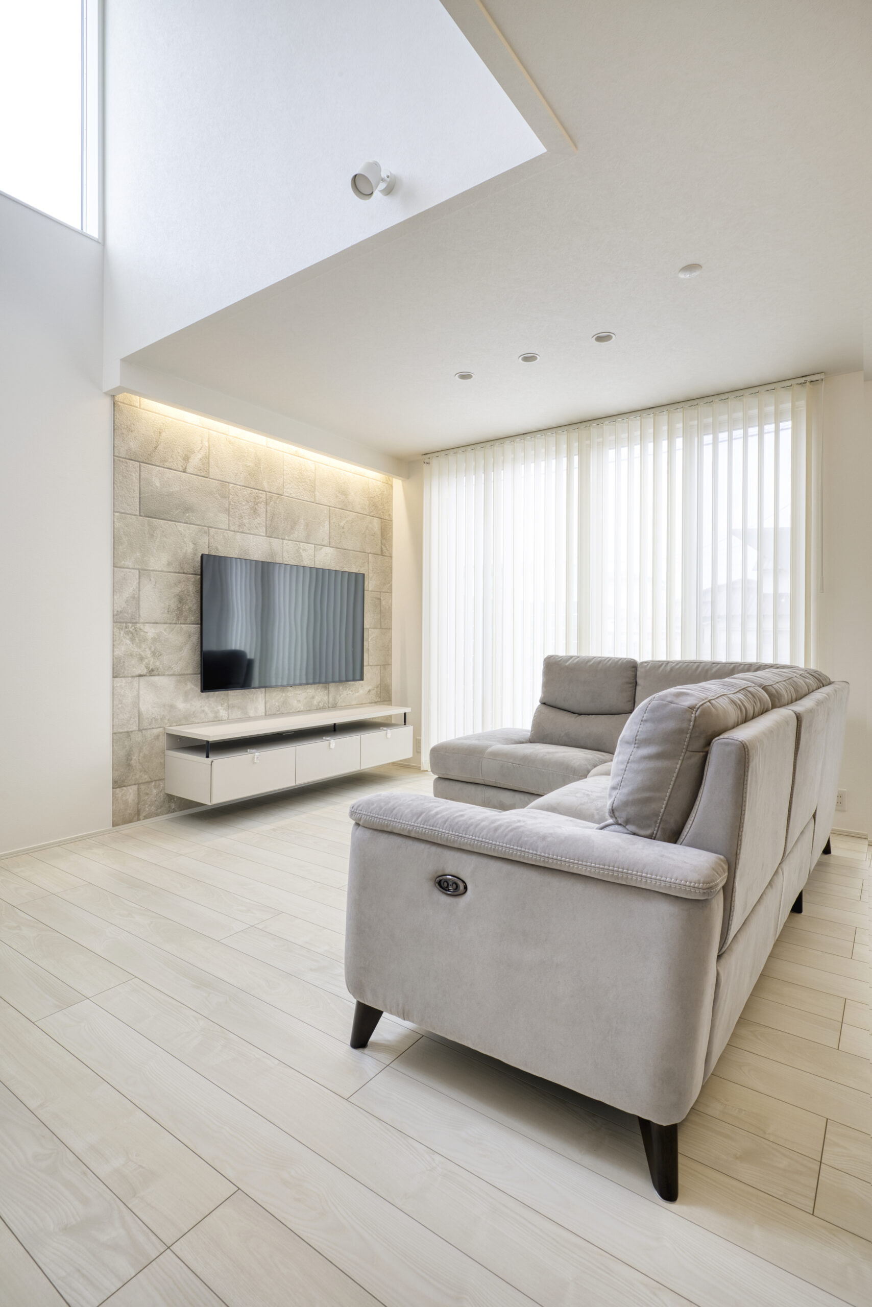 吹き抜けからの光が昼夜で表情を変え、家族時間を心地よく支える場所。テレビ背面には玄関とは違う印象のエコカラットプラスを採用し、高級感も演出。