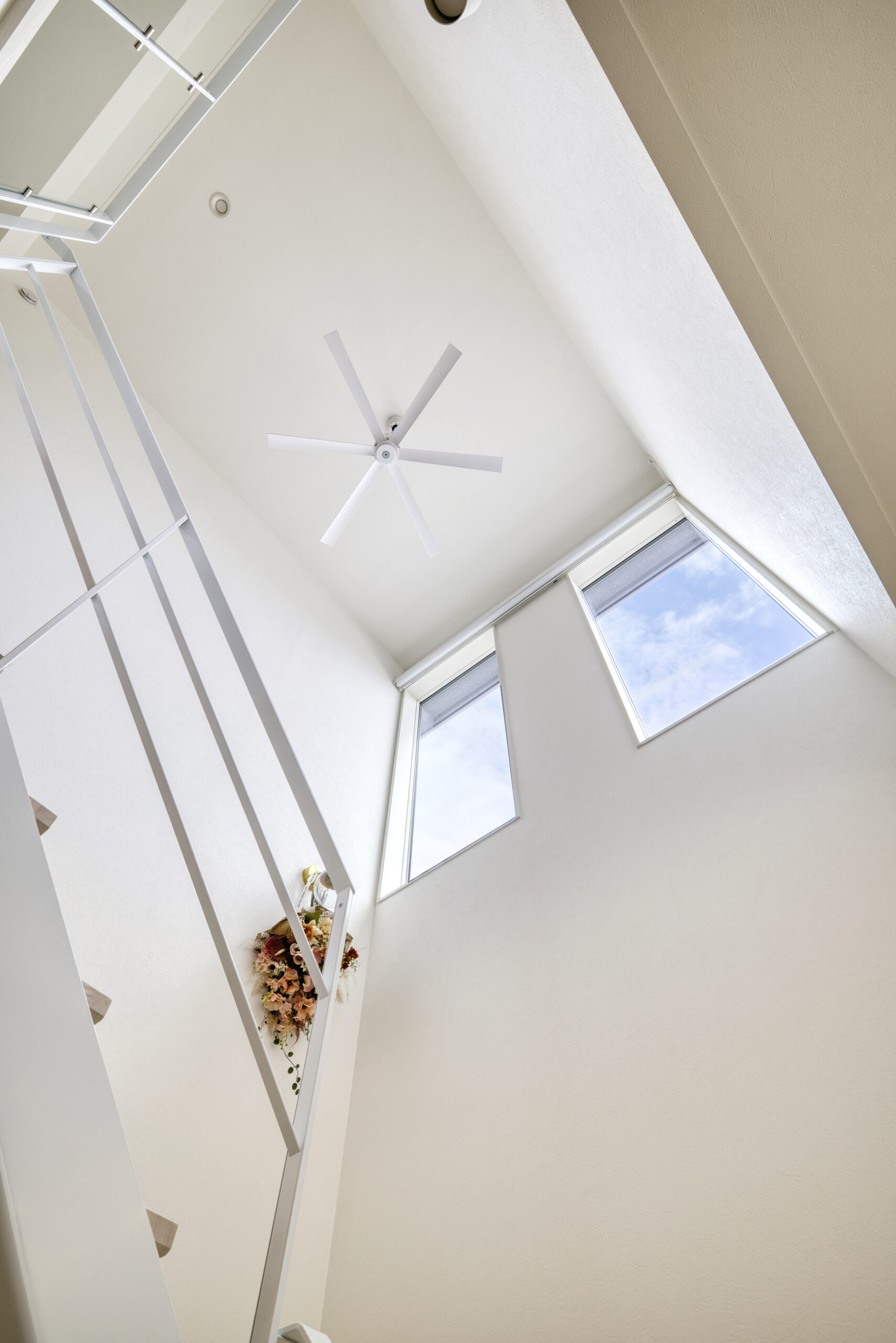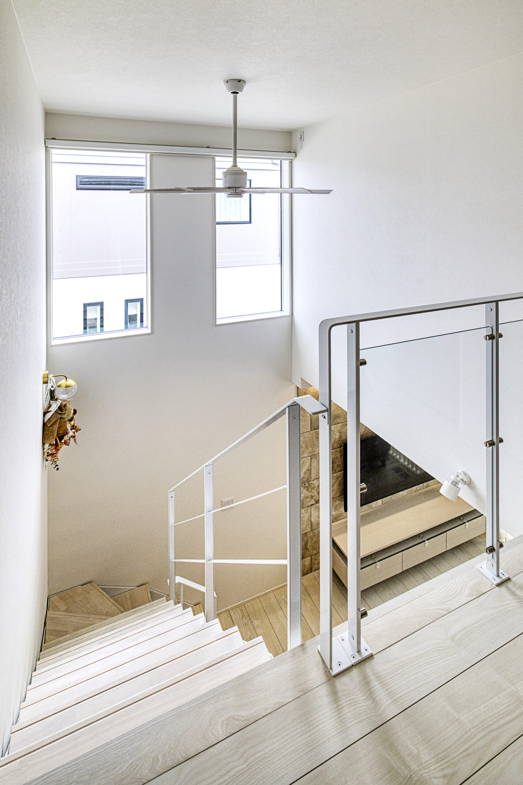 高窓からの光が階段まで届き、移動の時間さえも開放的に感じられる吹き抜け構成。