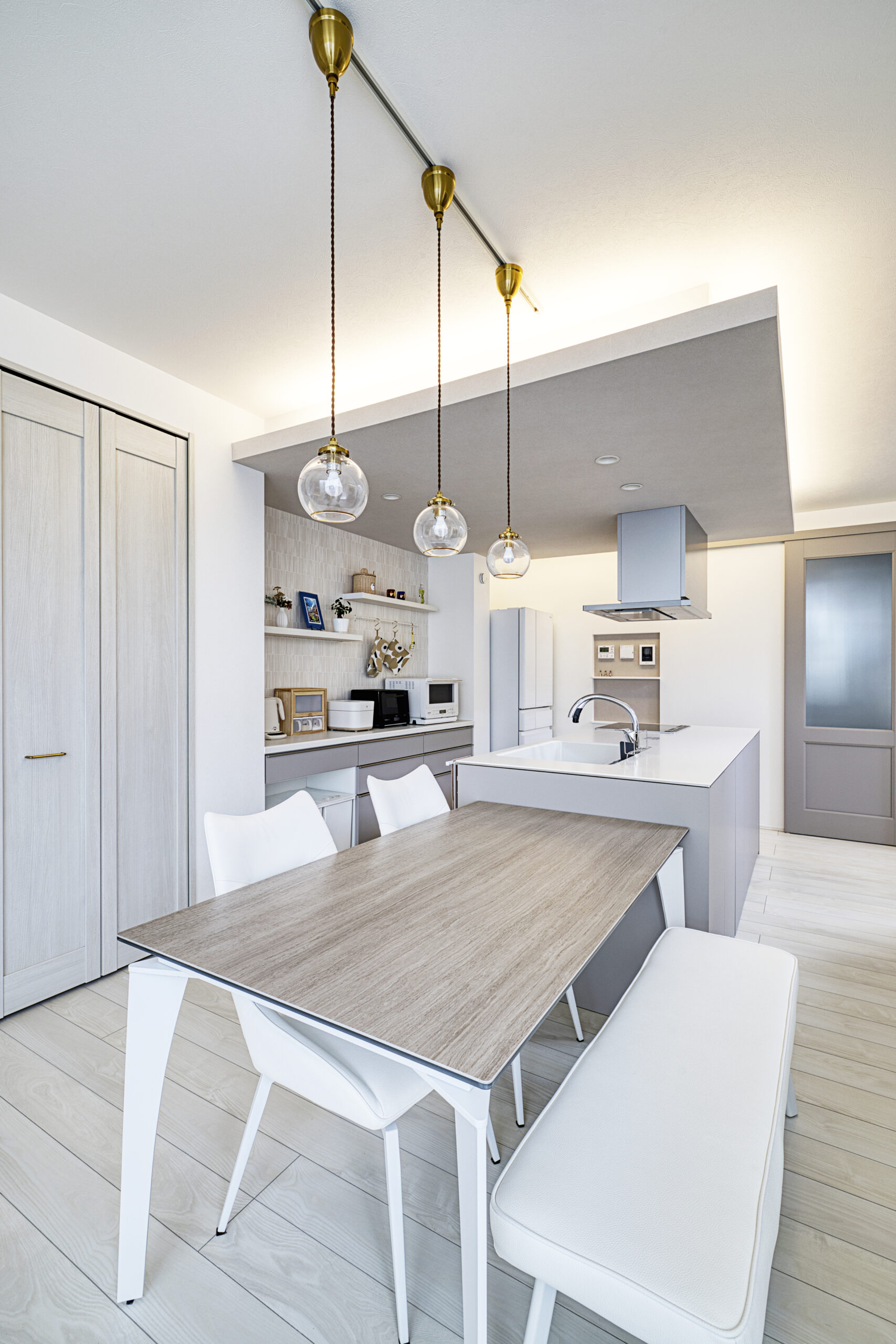 白とベージュでまとめ、視覚的にも落ち着きのある一体感を生んだLDK。優しい色使いでいつでもほっとする空間に。