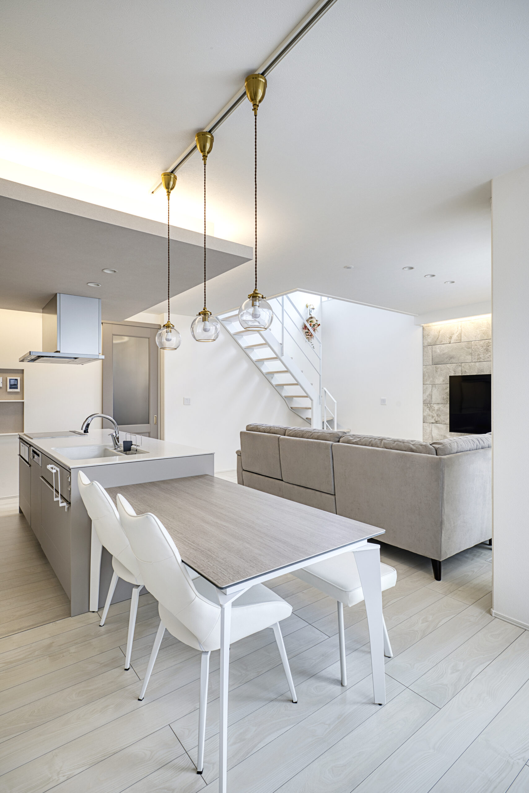 お子さまの誕生をきっかけに、これからの生活環境を見つめ直されたご夫婦。集合住宅で気になっていた生活音への配慮から、一戸建てでのびのびと暮らせる住空間を思い描きました。吹き抜けとオープン階段が生む縦の広がりや、白とベージュを基調にまとめた室内は、光を受け止めながら穏やかな一体感を育む事例です。