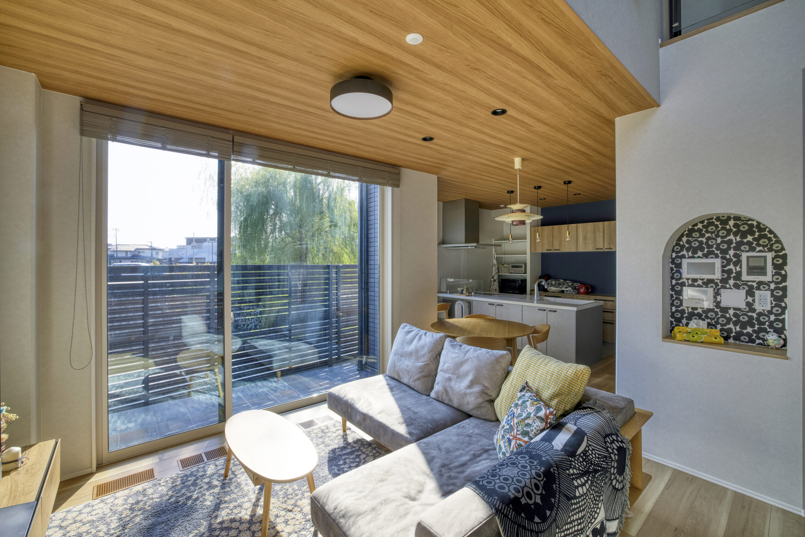 吹き抜けと大きな窓がもたらす明るく開放的なLDKに、個性的なアクセントクロスが映える住まい。デザイン性だけでなく、日々のストレスを軽減するスムーズな家事動線を徹底的に意識しました。機能と美しさが両立した、心地よい暮らしを実現する事例です。