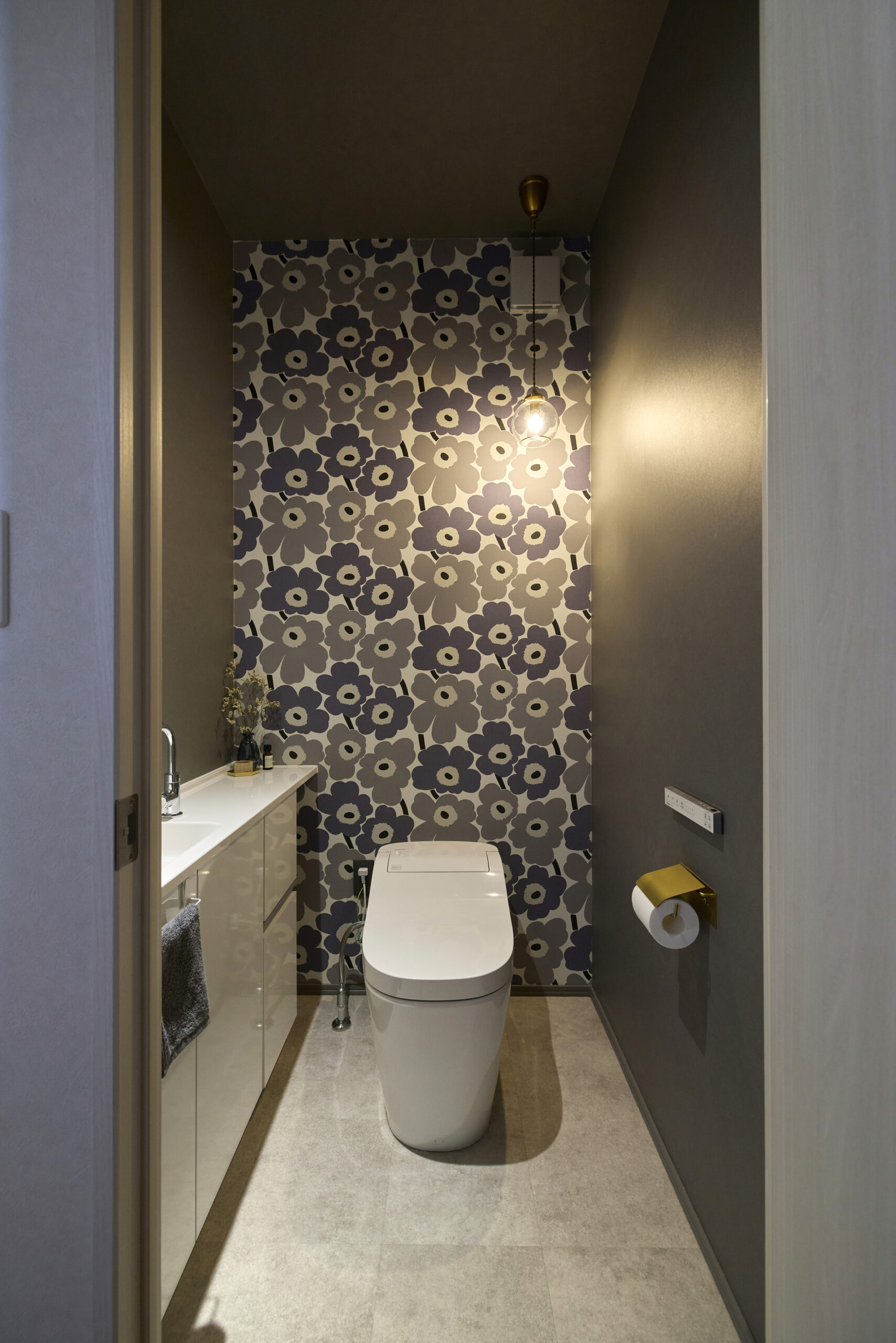 個性的なアクセントクロスが映えるホテルライクなトイレ。機能性・デザインを両立。洗練されたカラーコーディネートのプライベート空間。